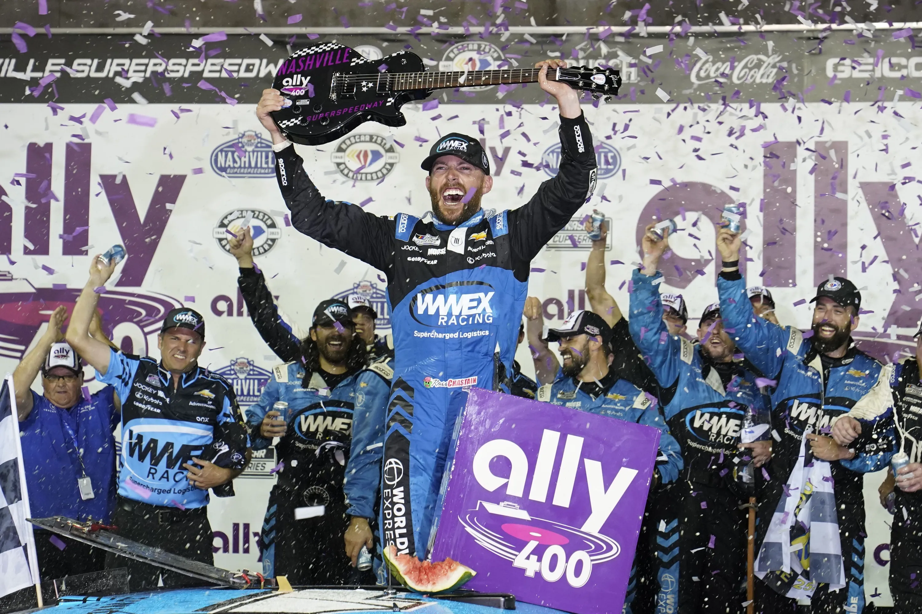 Ross Chastain holds a guitar presented to him after winning a NASCAR Cup Series auto race, Sunday, June 25, 2023, in Lebanon, Tenn. (Photo by George Walker IV/AP Photo)