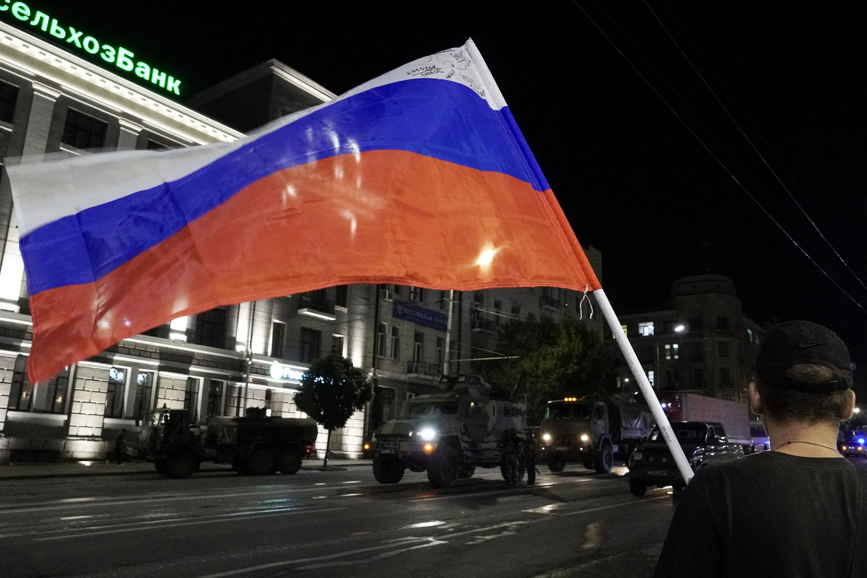A man waves the Russian national flag as the members of Wagner group prepare to pull out from the headquarters of the Southern Military District to return to their base in Rostov-on-Don late on June 24, 2023. (Photo by AFP Photo/Stringer)