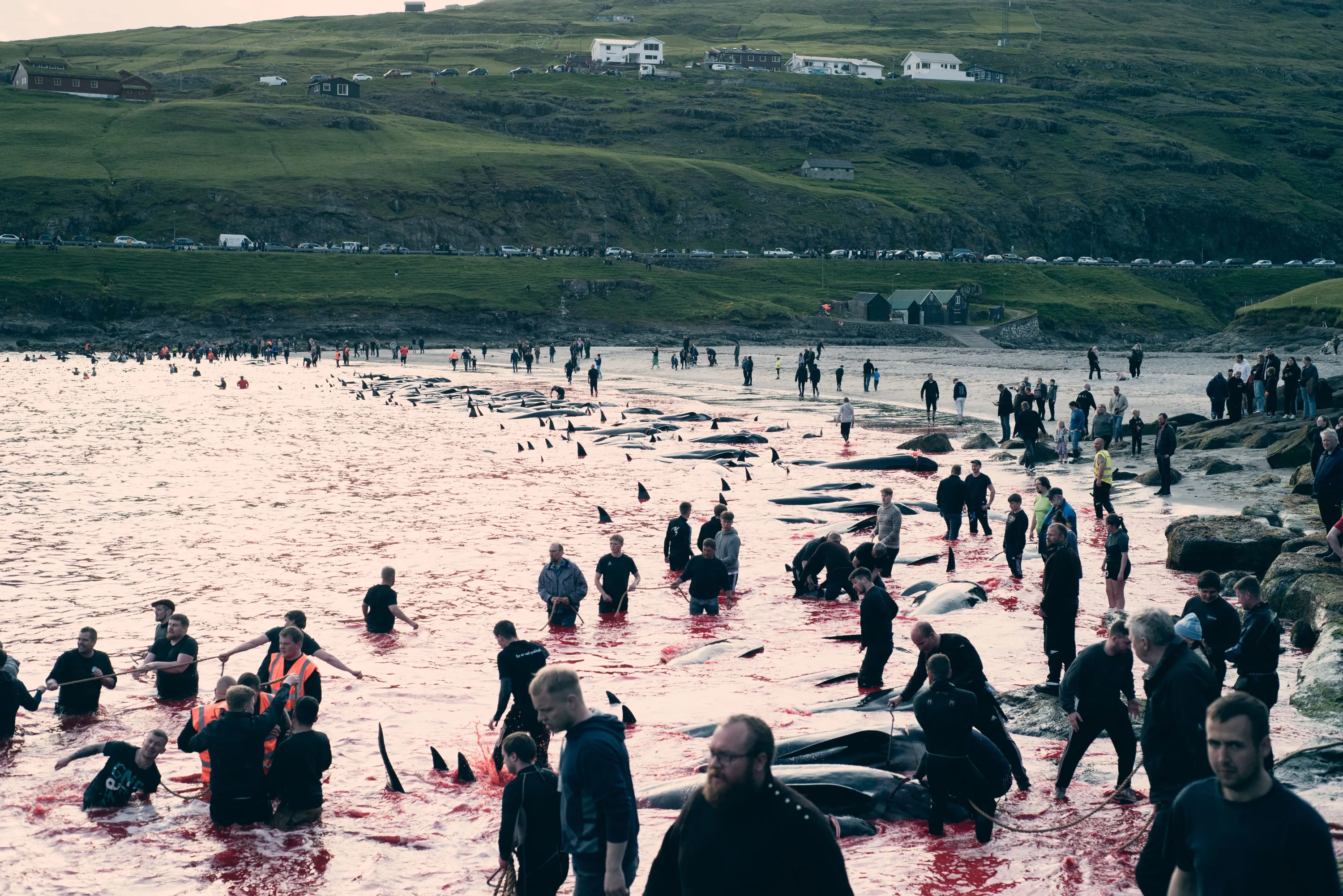 This handout picture released by Environmental NGO Sea Shepherd UK shows people hunting dolphins in Leynar on June 14, 2023. The Faroe Islands has killed more than 500 dolphins since its controversial hunt resumed in May, local authorities in Denmark's autonomous territory in the north Atlantic said. (Photo by SEA SHEPHERD UK/Handout via AFP Photo)