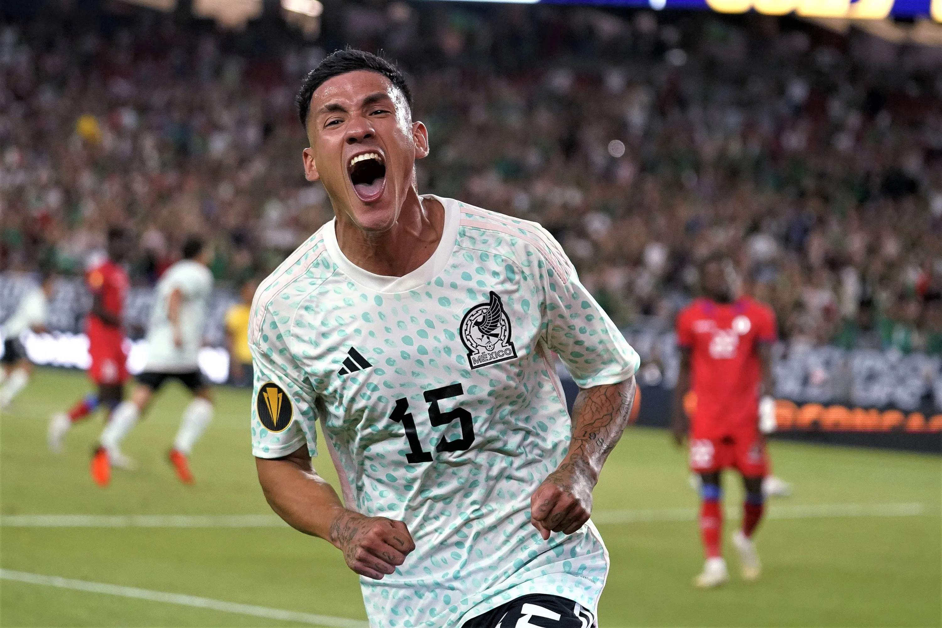 Mexico's Uriel Antuna celebrates the team's second goal against Haiti, during the second half of a CONCACAF Gold Cup soccer match Thursday, June 29, 2023, in Glendale, Ariz. Mexico won 3-1. (Photo by Darryl Webb/AP Photo)