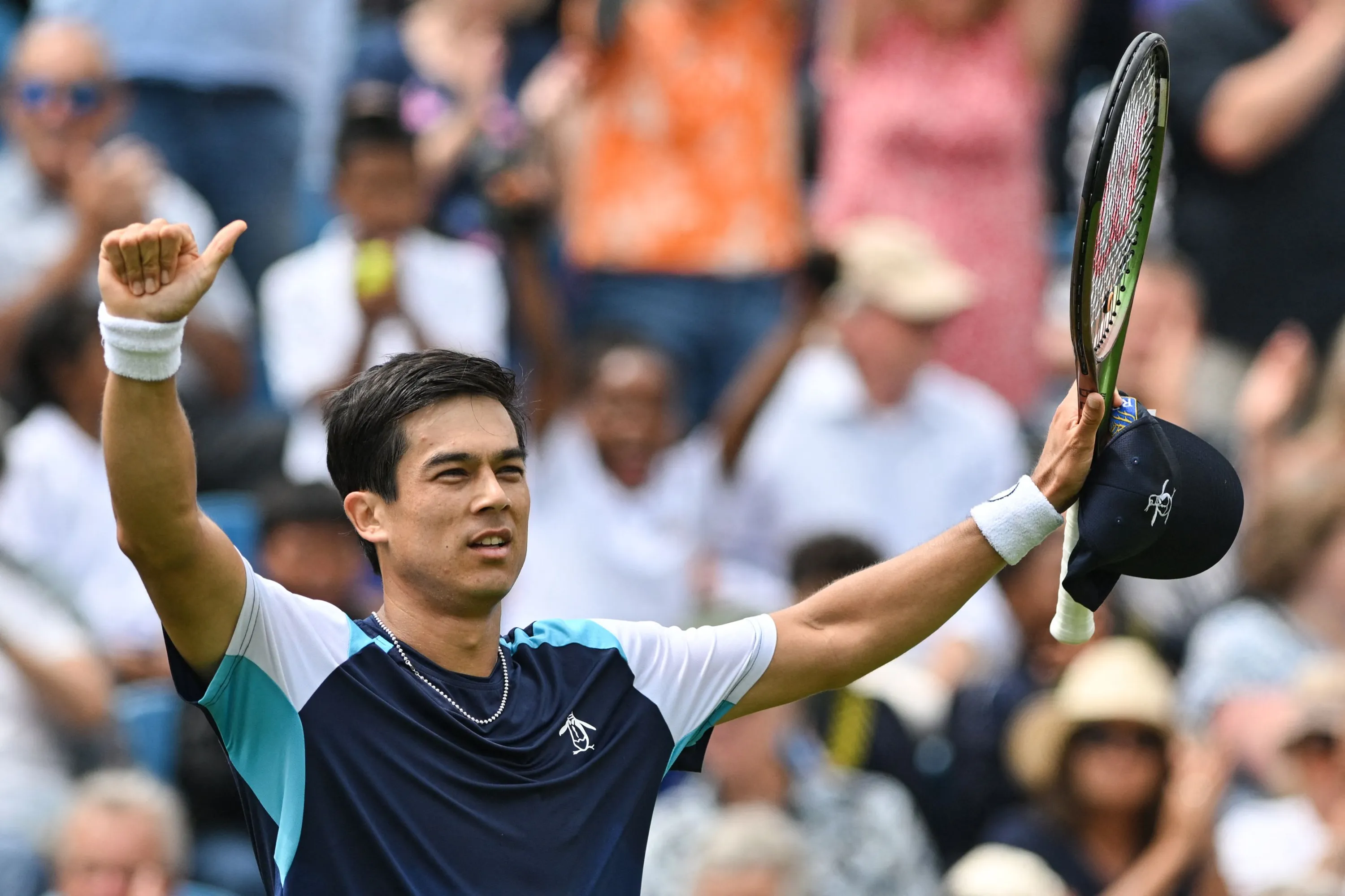 US player Mackenzie McDonald celebrates after winning against US player Taylor Fritz during their men's singles round of 16 tennis match at the Rothesay Eastbourne International tennis tournament in Eastbourne, southern England, on June 28, 2023. (Photo by Glyn Kirk/AFP Photo)