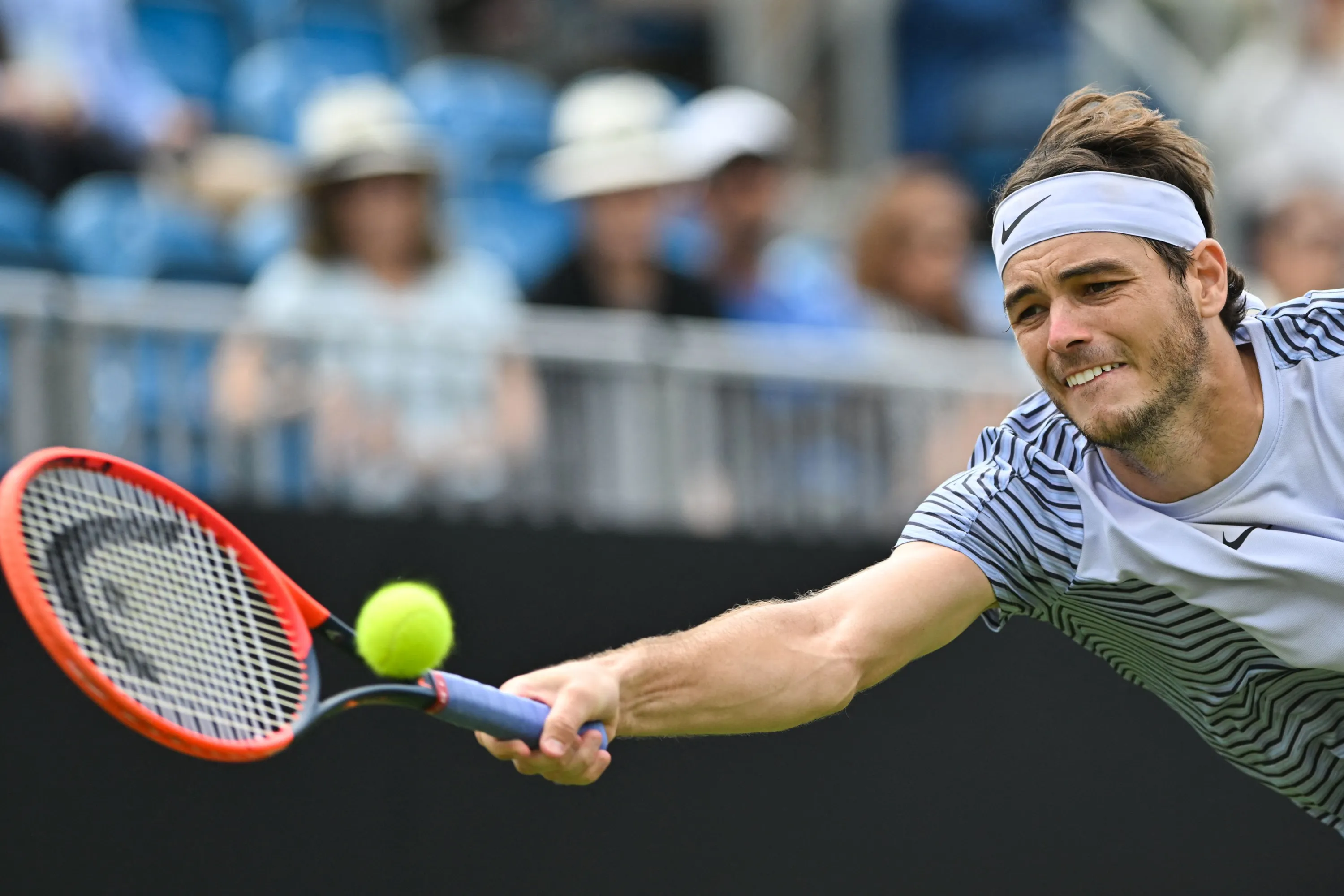 US player Taylor Fritz returns to US player Mackenzie McDonald during their men's singles round of 16 tennis match at the Rothesay Eastbourne International tennis tournament in Eastbourne, southern England, on June 28, 2023. (Photo by Glyn Kirk/AFP Photo)