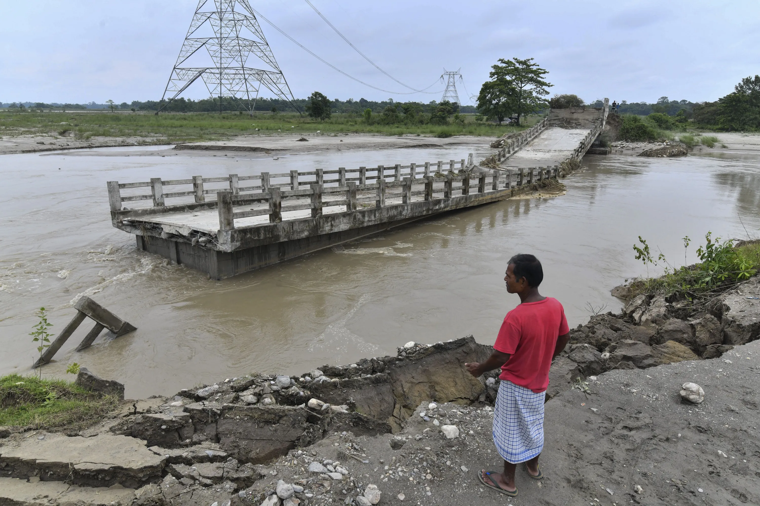A man watches a bridge over the Motanga River washed away by flash floods following monsoon rains, in Ulubari village of Baska district, some 52 Km from Guwahati in India's Assam state on June 23, 2023. At least 19 people are dead after floods triggered by South Asia's annual monsoon, with a week of relentless rains forcing thousands of people to seek shelter in India. (Photo by Biju Boro/AFP Photo)