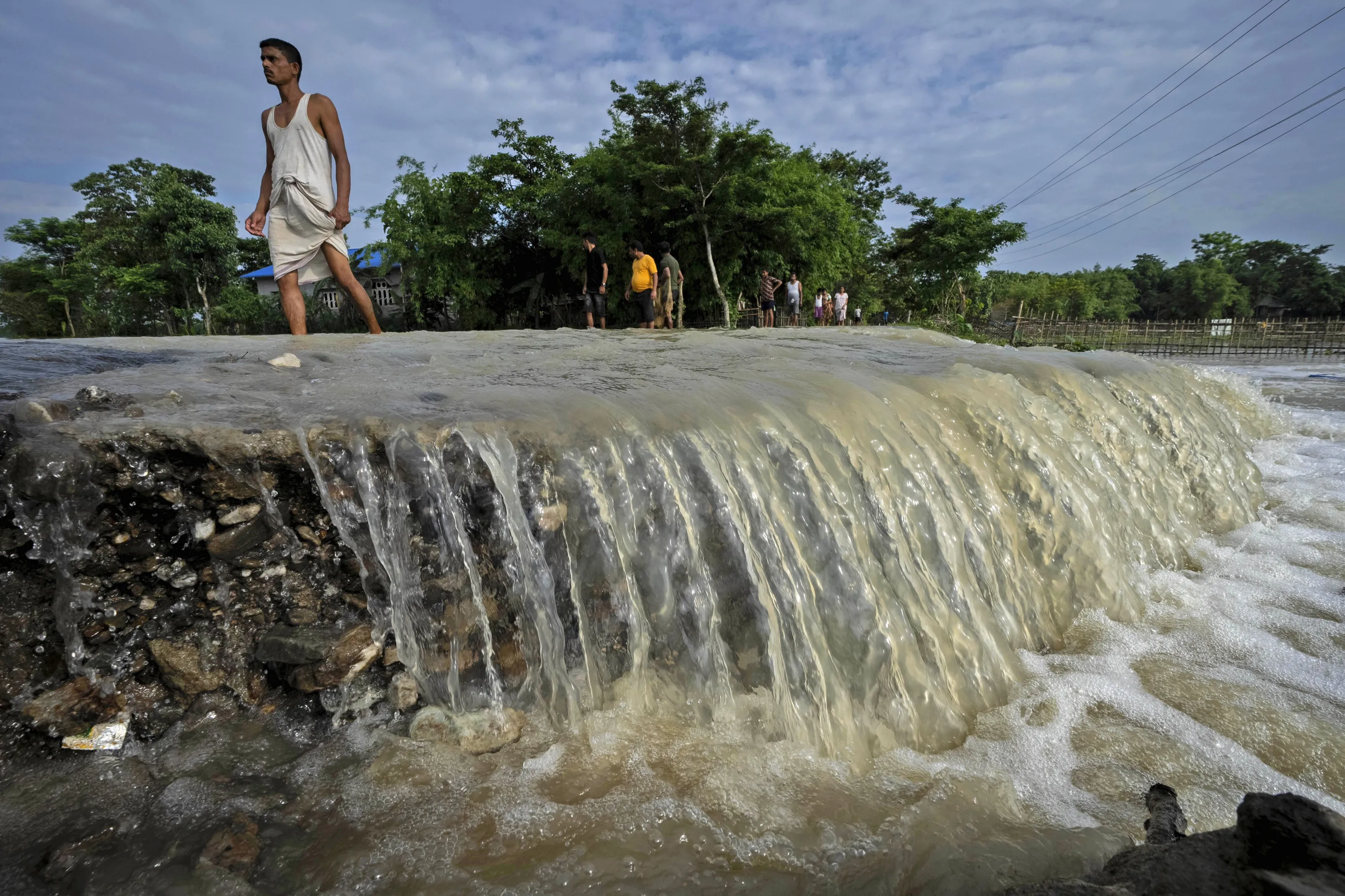 Villagers wade through a road damaged by floodwaters in Chamata village, west of Guwahati, India, Friday, June 23, 2023. (Photo by Anupam Nath/AP Photo)