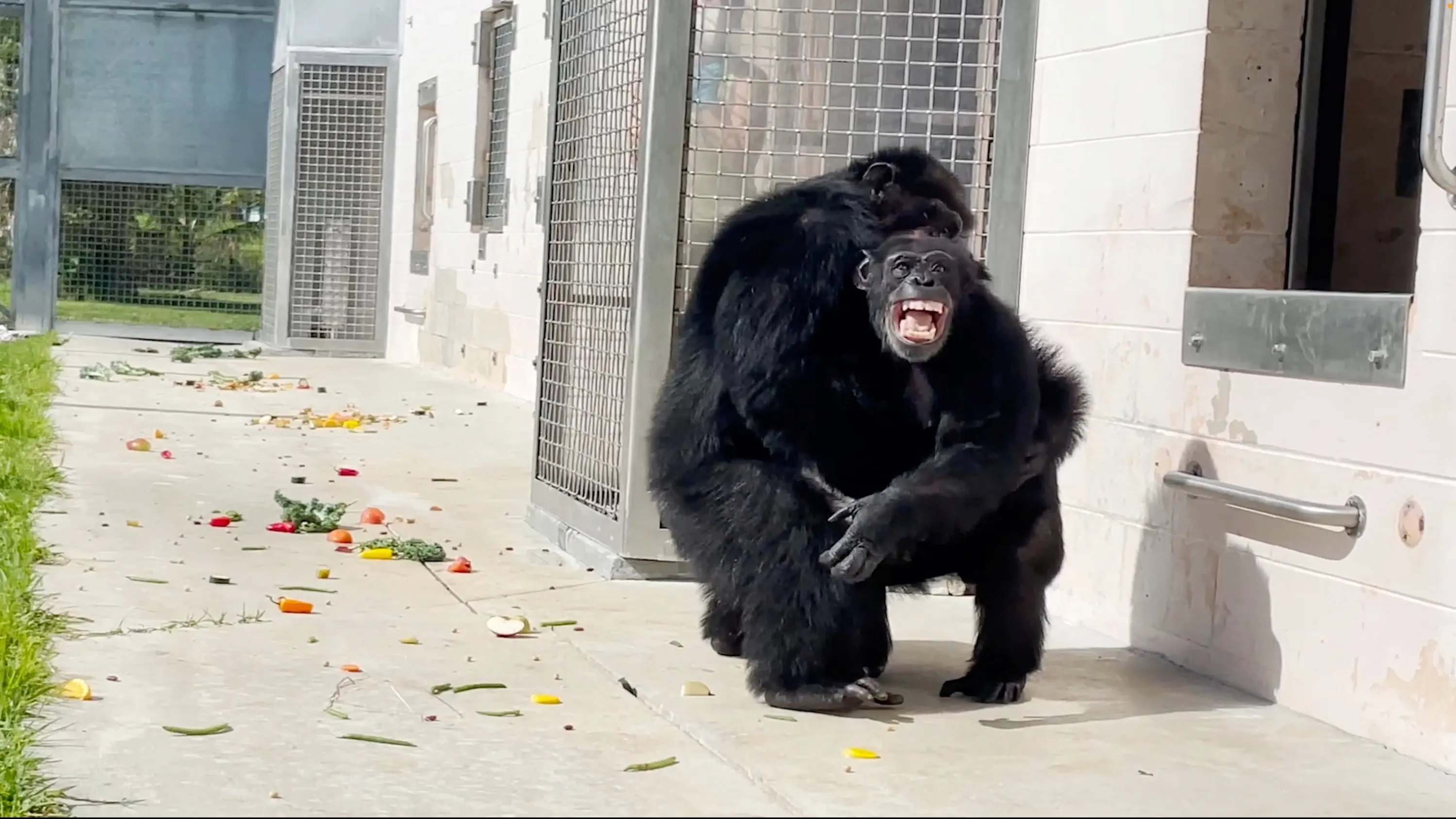 Vanilla the chimpanzee, caged for entire life, reacts after seeing the sky for the first time, at Save the Chimps sanctuary, in Fort Pierce, Florida, U.S., in this screengrab obtained from a social media video released in June, 2023. (Photo by Save the Chimps via Reuters)