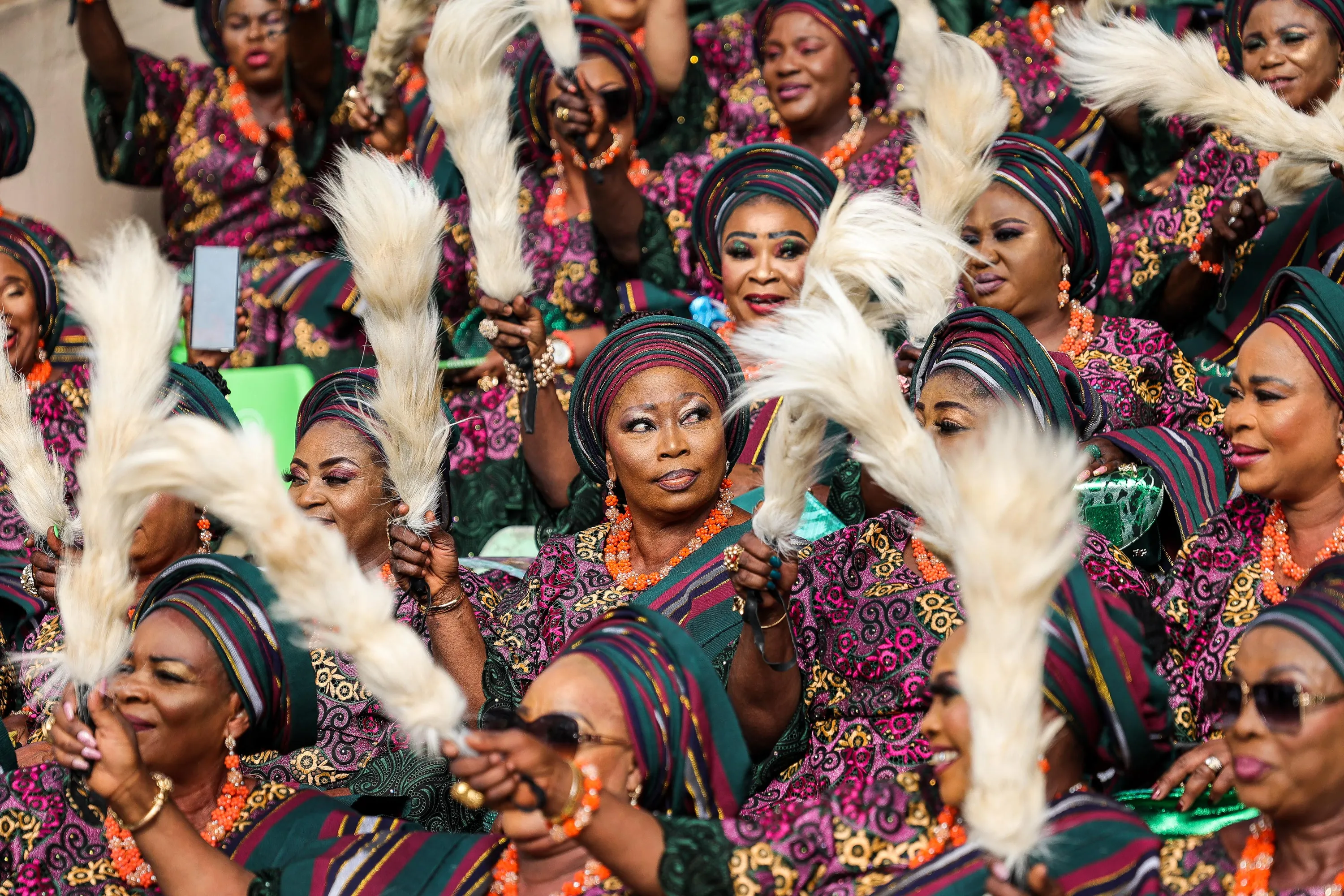 Women of the Egbe Jagunmolu obirin Age group wave their horsetails at the Ojude Oba festival in Ijebu, Ogun state, Nigeria on June 30, 2023. (Photo by Samuel Alabi/AFP Photo)