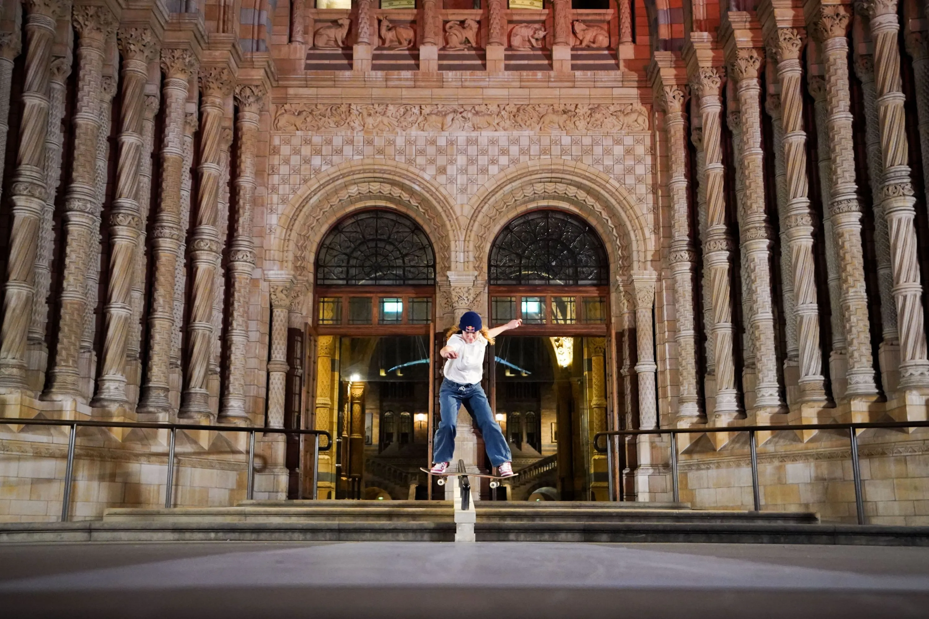 Previously unissued photo dated June 4, 2023 of professional street skateboarder Lorre Bruggeman at the Natural History Museum as she creates a once in a lifetime skate film at the London attraction. (Photo by James Manning/PA Wire)