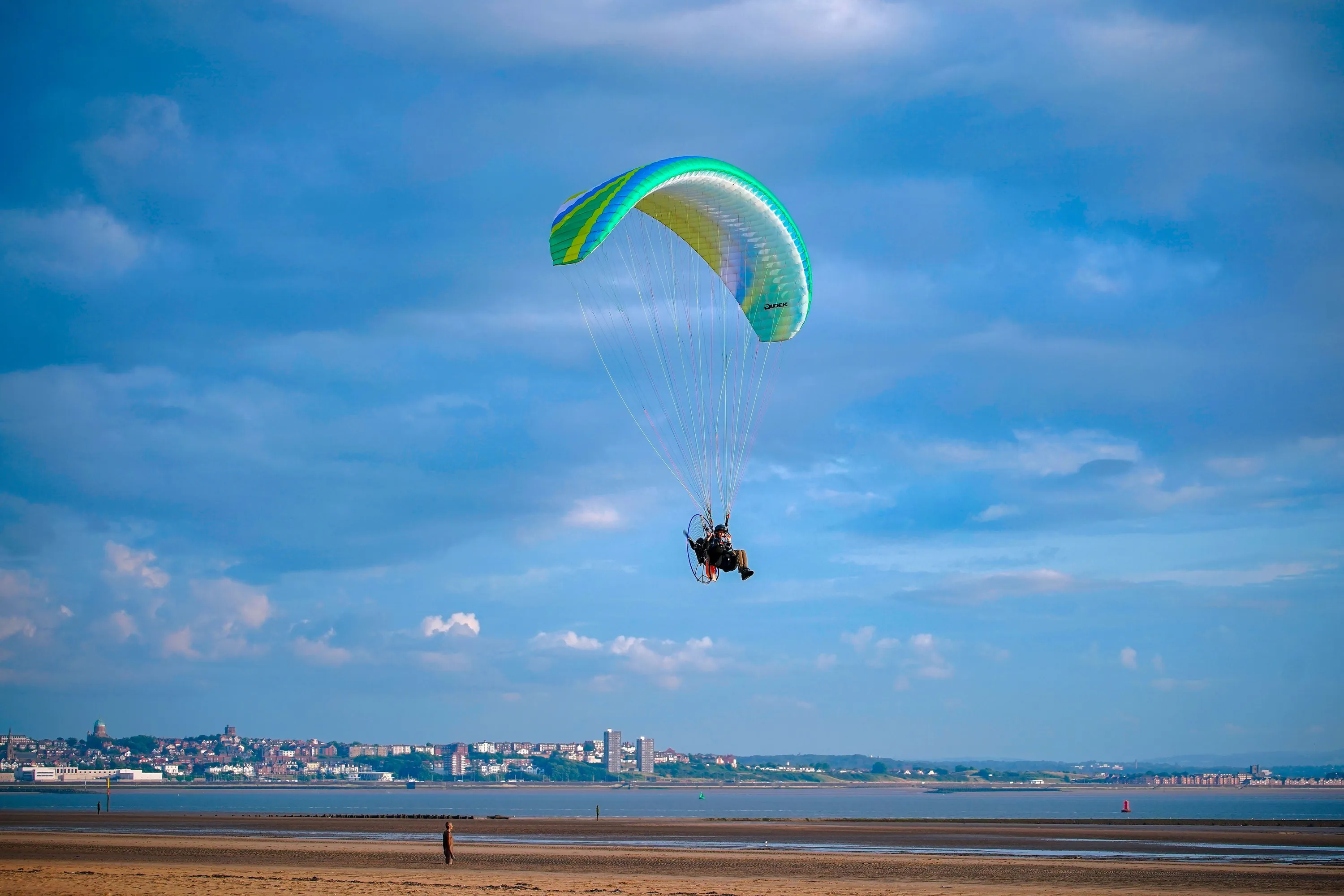 A man flying a paramotor over Crosby Beach, Merseyside, North West England on the eve of the Summer Solstice on Tuesday, June 20, 2023. (Photo by Peter Byrne/PA Images via Getty Images)