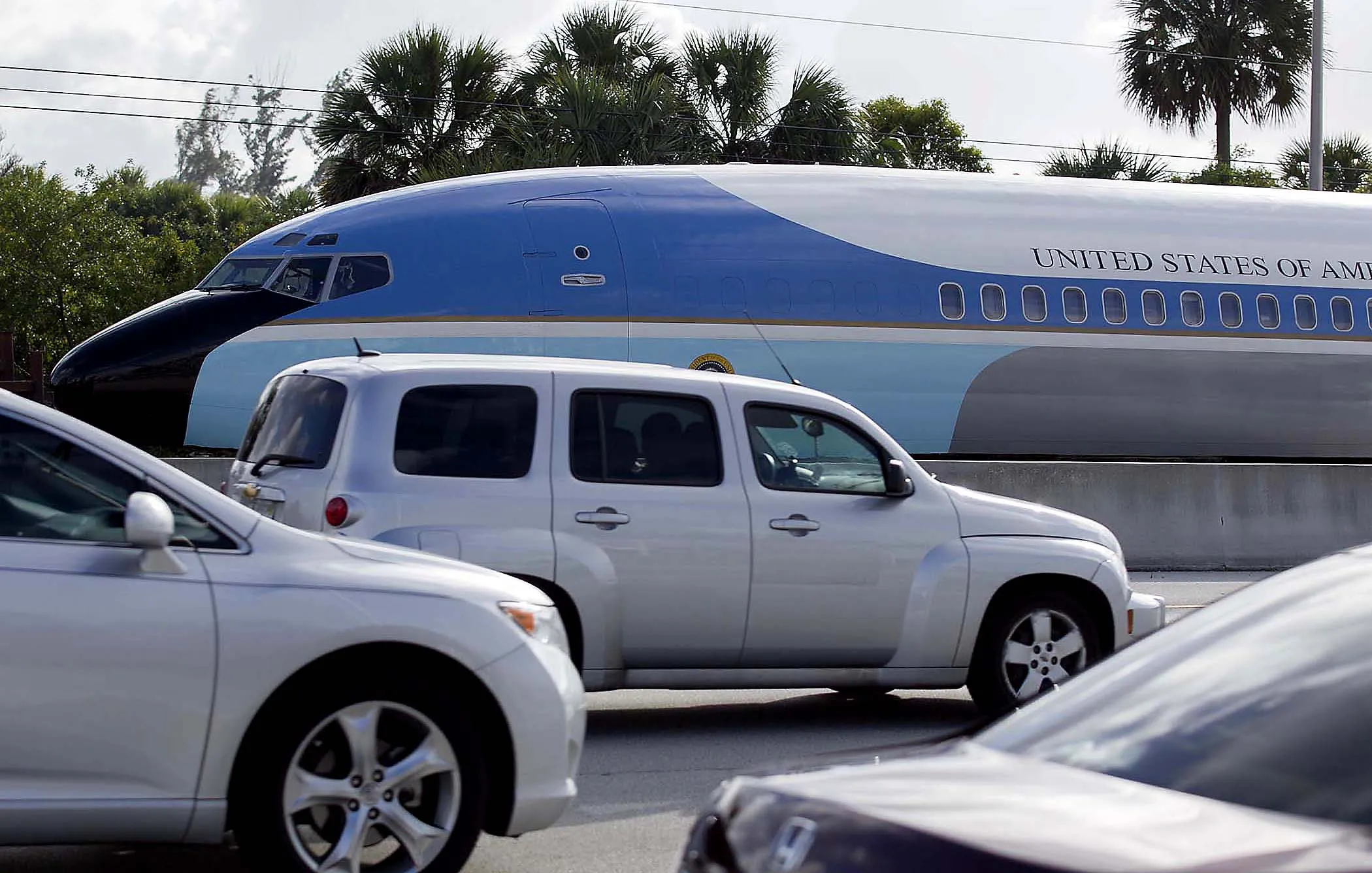 A replica of Air Force One travels on a flatbed truck eastbound on Southern Blvd. to the South Florida Fairgrounds in West Palm Beach, January 9, 2013. The 65-foot by 12-foot fuselage replicates the Air Force One that was used for nearly three decades, from President John F. Kennedy through President Ronald Reagan. The South Florida Fair's Exposition Hall will take on a presidential look later in the month. A number of new attractions will be set up in the 70,000 square foot expo space with the theme, “Washington, D.C., Our Nation's Capital”. (Photo by Allen Eyestone/The Palm Beach Post)