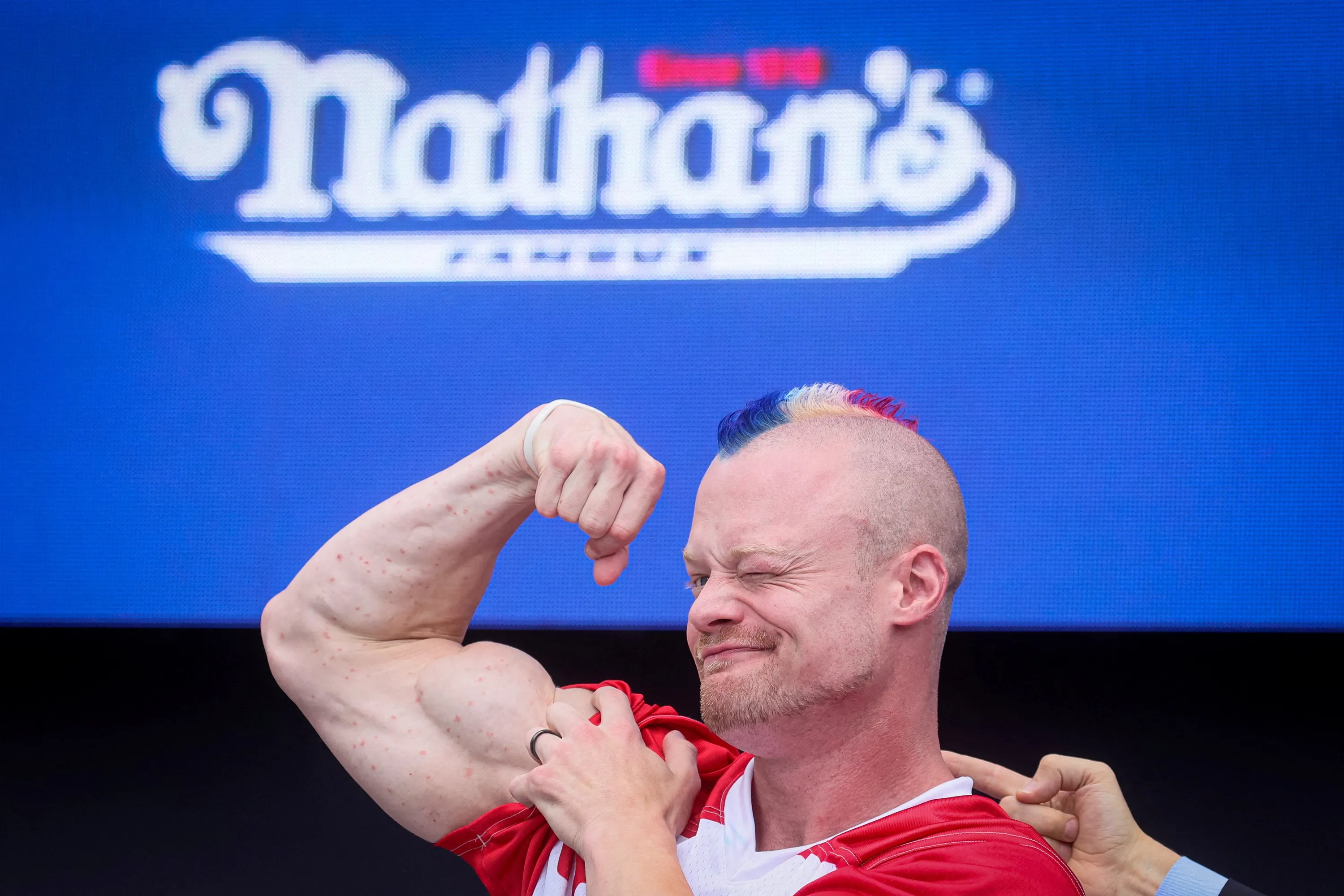 Competitive eater Nick Wehry is introduced during a weigh-in ceremony before the Nathan's Famous July Fourth hot dog eating contest, Monday, July 3, 2023, in New York. (Photo by John Minchillo/AP Photo)