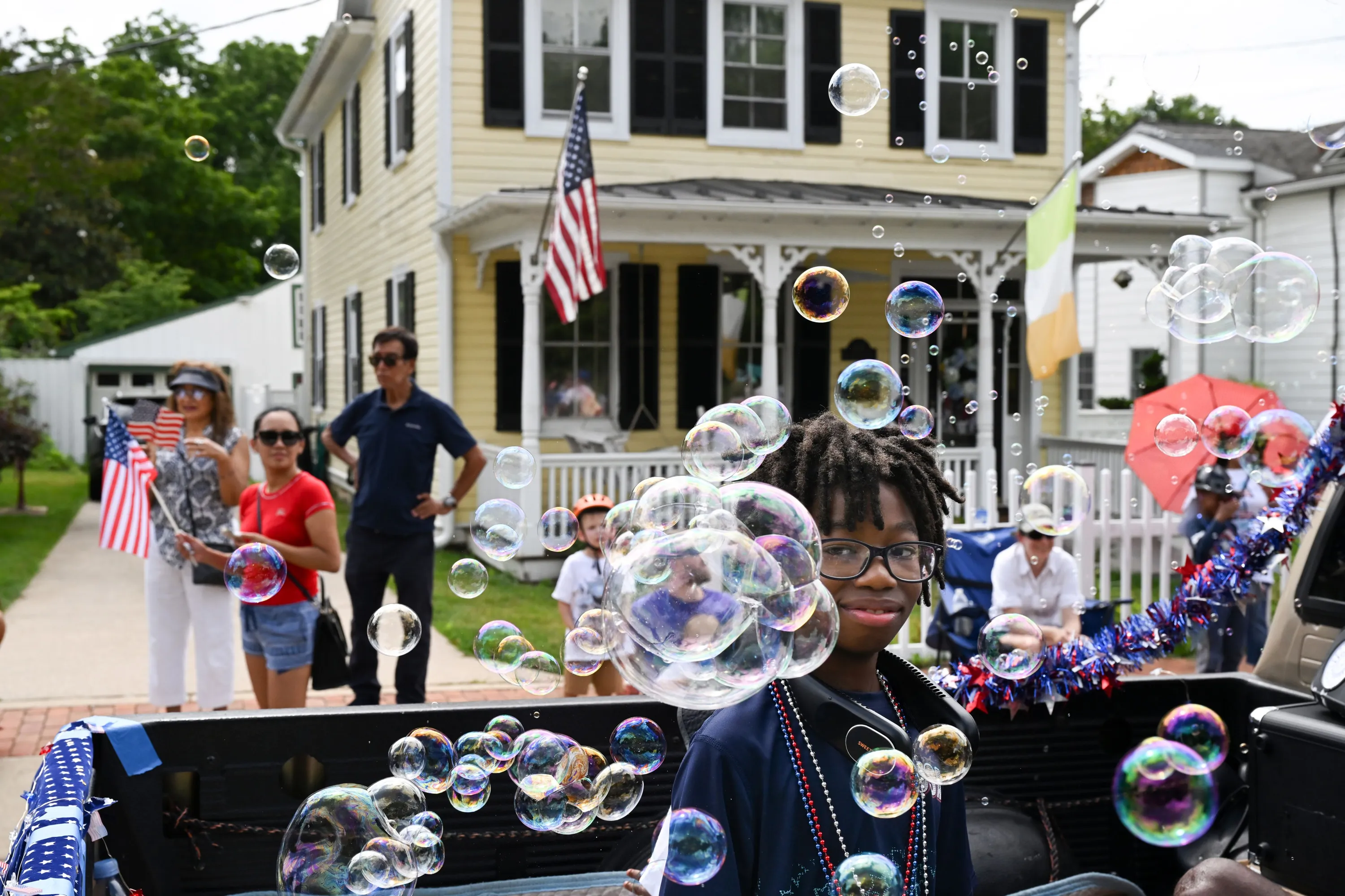 Javon Buckner, 12, is framed by bubbles while riding in a truck during the 4th of July Parade on Monday July 04, 2023 in Leesburg, VA. (Photo by Matt McClain/The Washington Post)