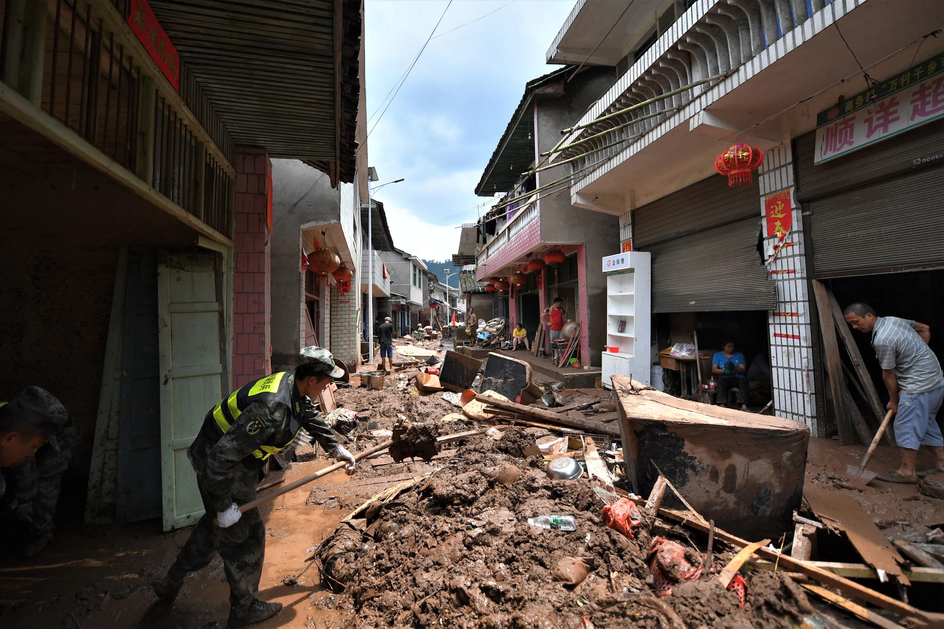 Local people clean up silt and garbage in Caotan Village of Yantouzhai Town, Hunan Province, China 02 July 2023. Torrential rain has been battering parts of Hunan since 29 June with the Xiangxi Tujia and Miao Autonomous Prefecture experiencing the most severe rainfall since the flood season, according to the Hunan provincial flood and drought control headquarters on 01 July. (Photo by Chen Zhenhai/EPA via Xinhua News Agency)
