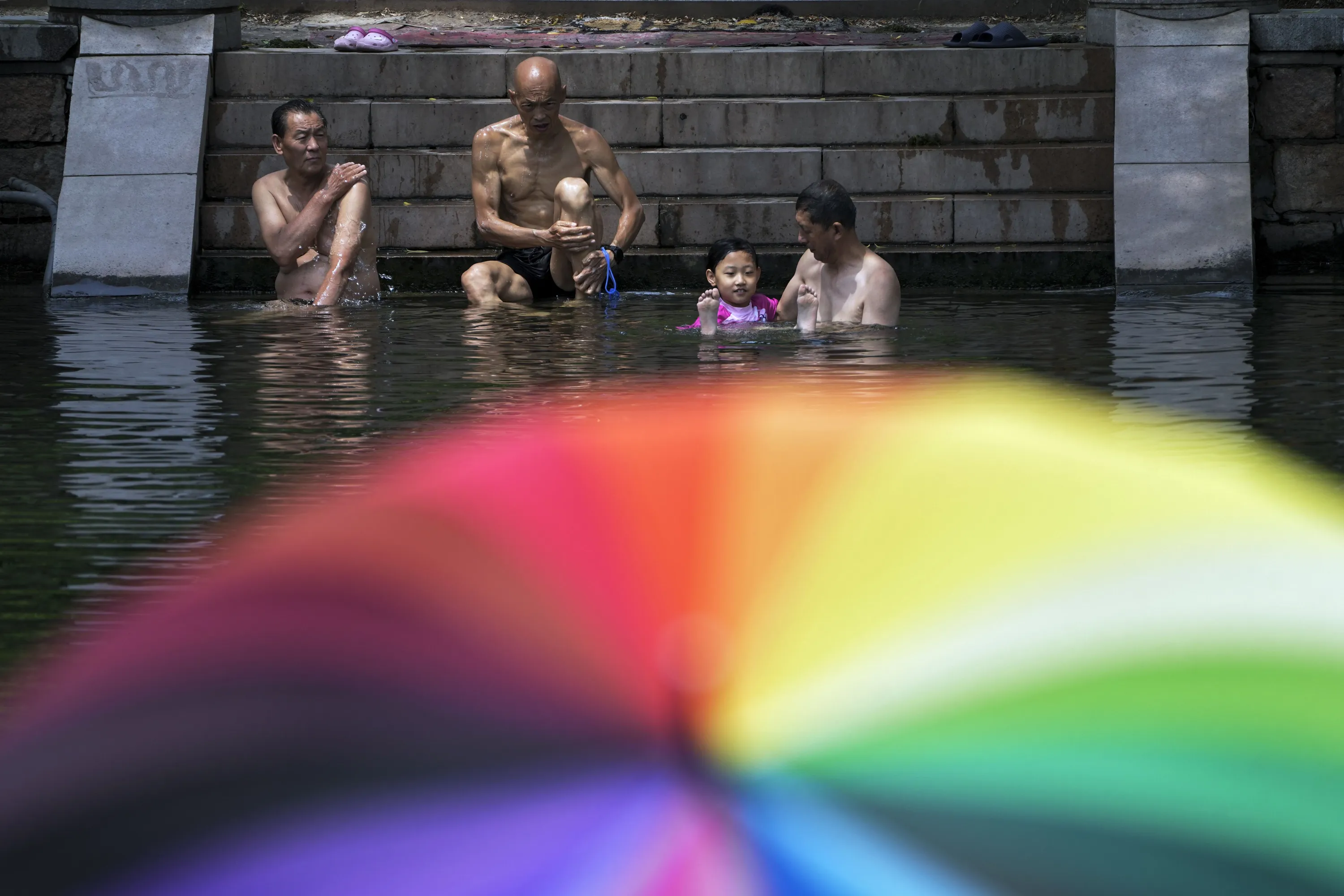 Residents cool off from a hot day at an urban waterway in Beijing, Monday, July 3, 2023. (Photo by Andy Wong/AP Photo)