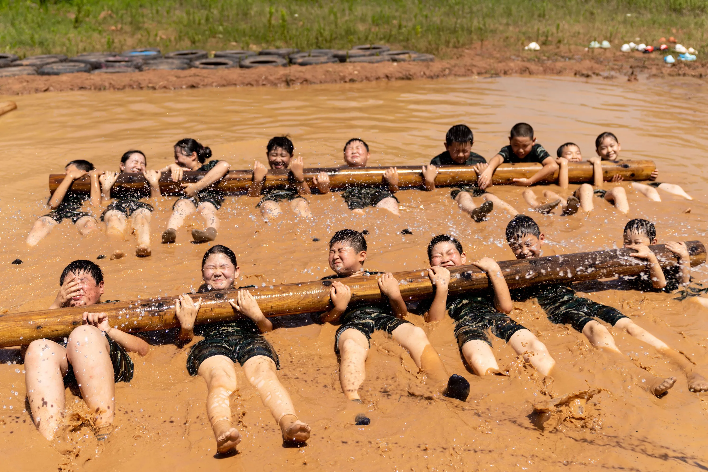 Children are training during the “Tactical Quagmire” program at a military summer camp in Hefei, Anhui Province, China on July 5, 2023. (Photo by Costfoto/NurPhoto via Getty Images)