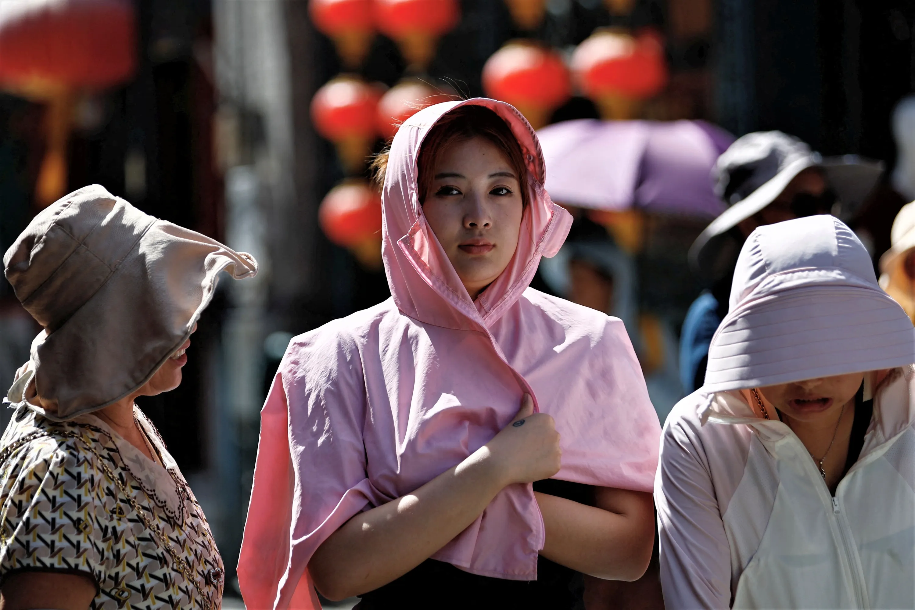 People wearing sun protection gear walk on a street, amid a red alert for heatwave in Beijing, China on July 6, 2023. (Photo by Tingshu Wang/Reuters)