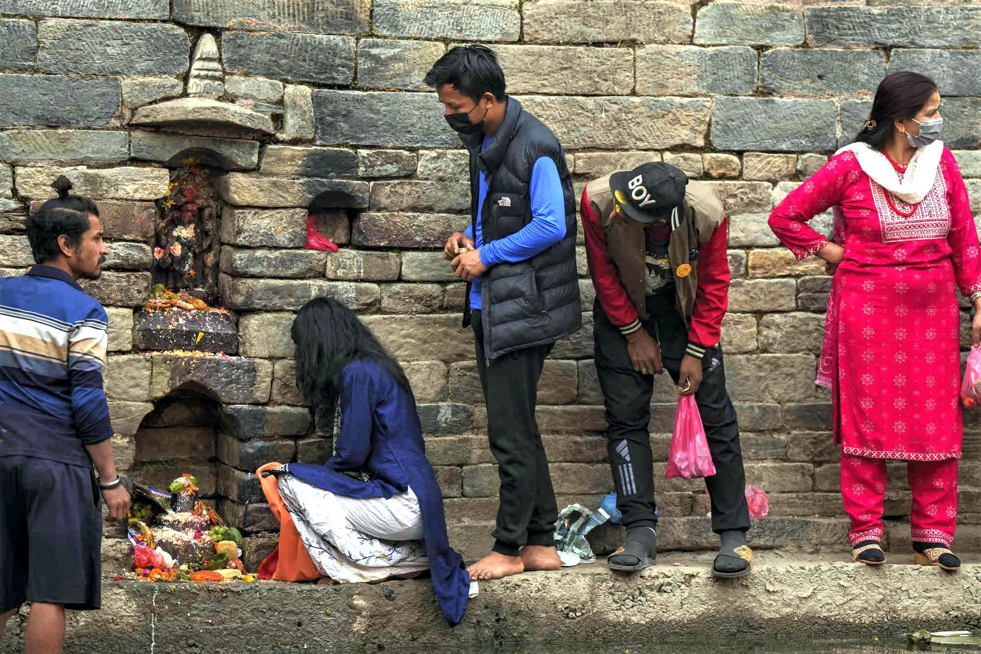 Hindu devotees queue up on a narrow ledge on the banks of the Bagmati river to offer prayers in front of an idol of Astamatrika, representing eight divine mother goddesses, at the Pashupatinath temple premises in Kathmandu, Nepal, Thursday, April 20, 2023. Nepalese Hindus on Thursday were marking Matatirtha Aunshi festival during which they pay tribute to their deceased mothers. (Photo by Niranjan Shrestha/AP Photo)