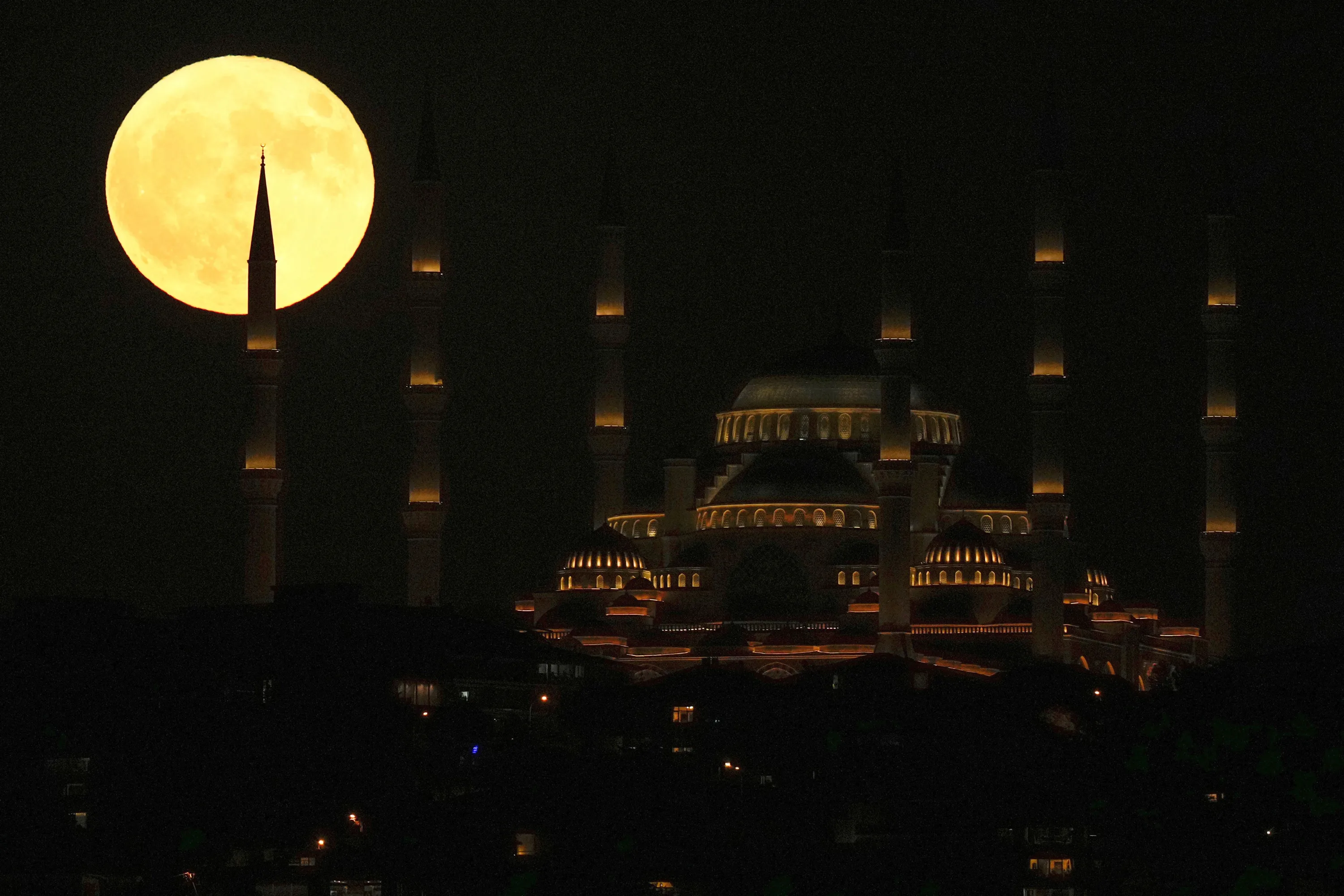 A super moon rises behind Camlica mosque in Istanbul, Turkey, Monday, July 3, 2023. (Photo by Francisco Seco/AP Photo)