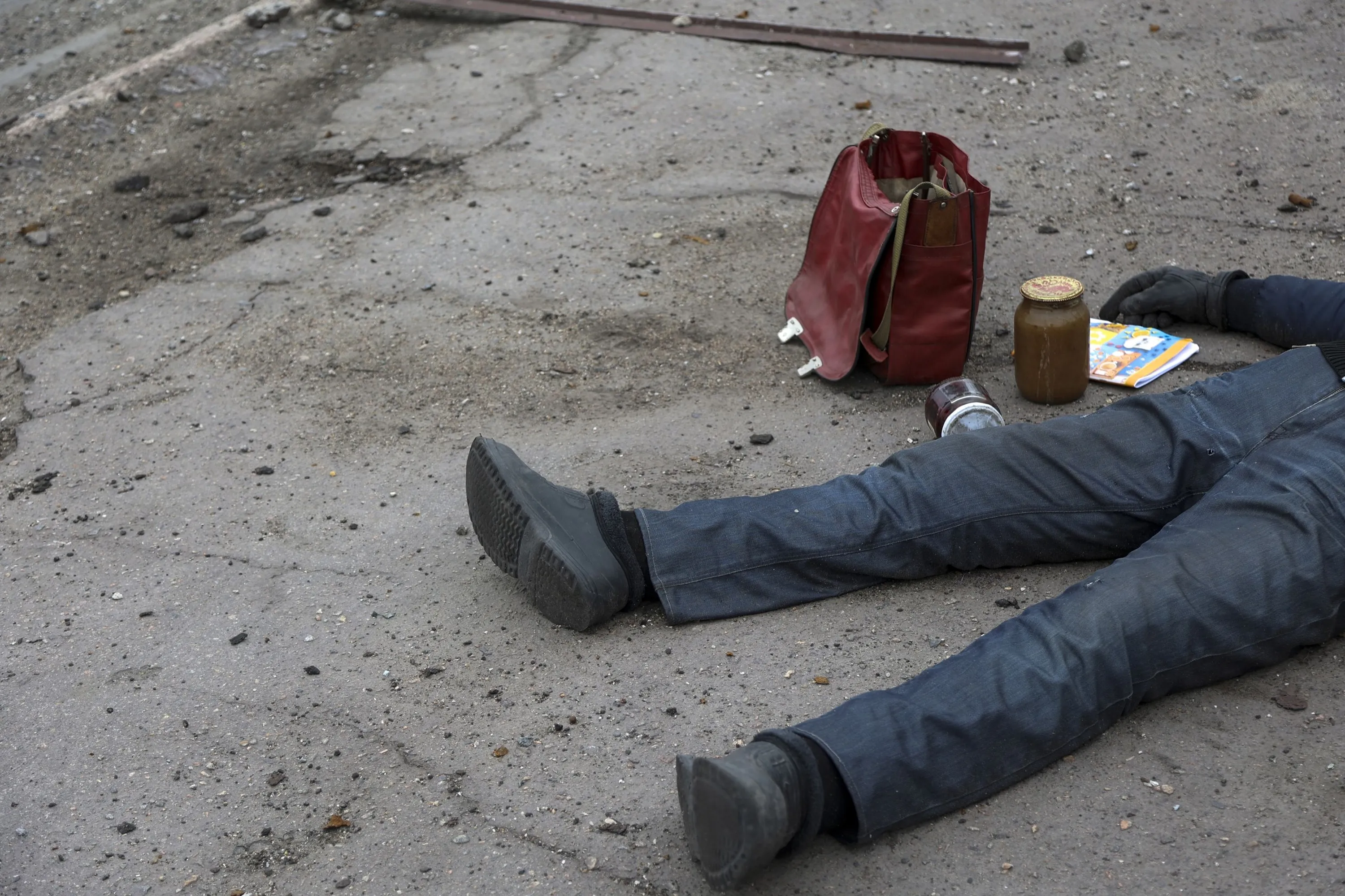 The body of a civilian lies on the ground at a bus stop not far from a destroyed during a heavy fighting part of the Illich Iron & Steel Works Metallurgical Plant, the second largest metallurgical enterprise in Ukraine, in an area controlled by Russian-backed separatist forces in Mariupol, Ukraine, Saturday, April 16, 2022. Mariupol, a strategic port on the Sea of Azov, has been besieged by Russian troops and forces from self-proclaimed separatist areas in eastern Ukraine for more than six weeks. (Photo by Alexei Alexandrov/AP Photo)