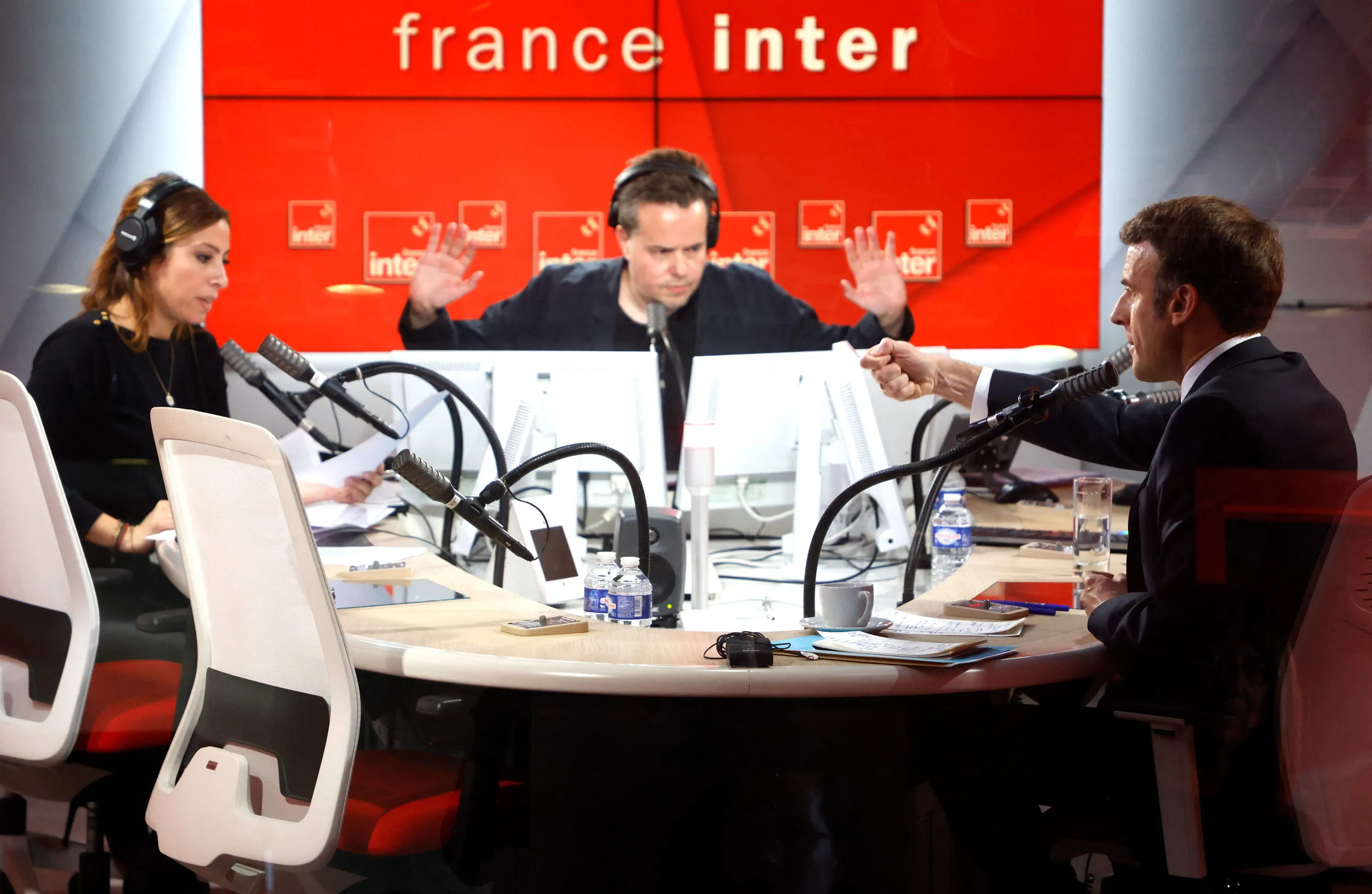 French President and liberal party La Republique en Marche (LREM) candidate for re-election Emmanuel Macron answers French-Lebanese journalist Lea Salame (L) and French journalist Nicolas Demorand (C) during the France Inter 7/9 radio broadcast at the Maison de la Radio in Paris, on April 4, 2022. French voters head to the polls for a two-round presidential election on April 10 and 24, 2022. (Photo by Ludovic Marin/AFP Photo)