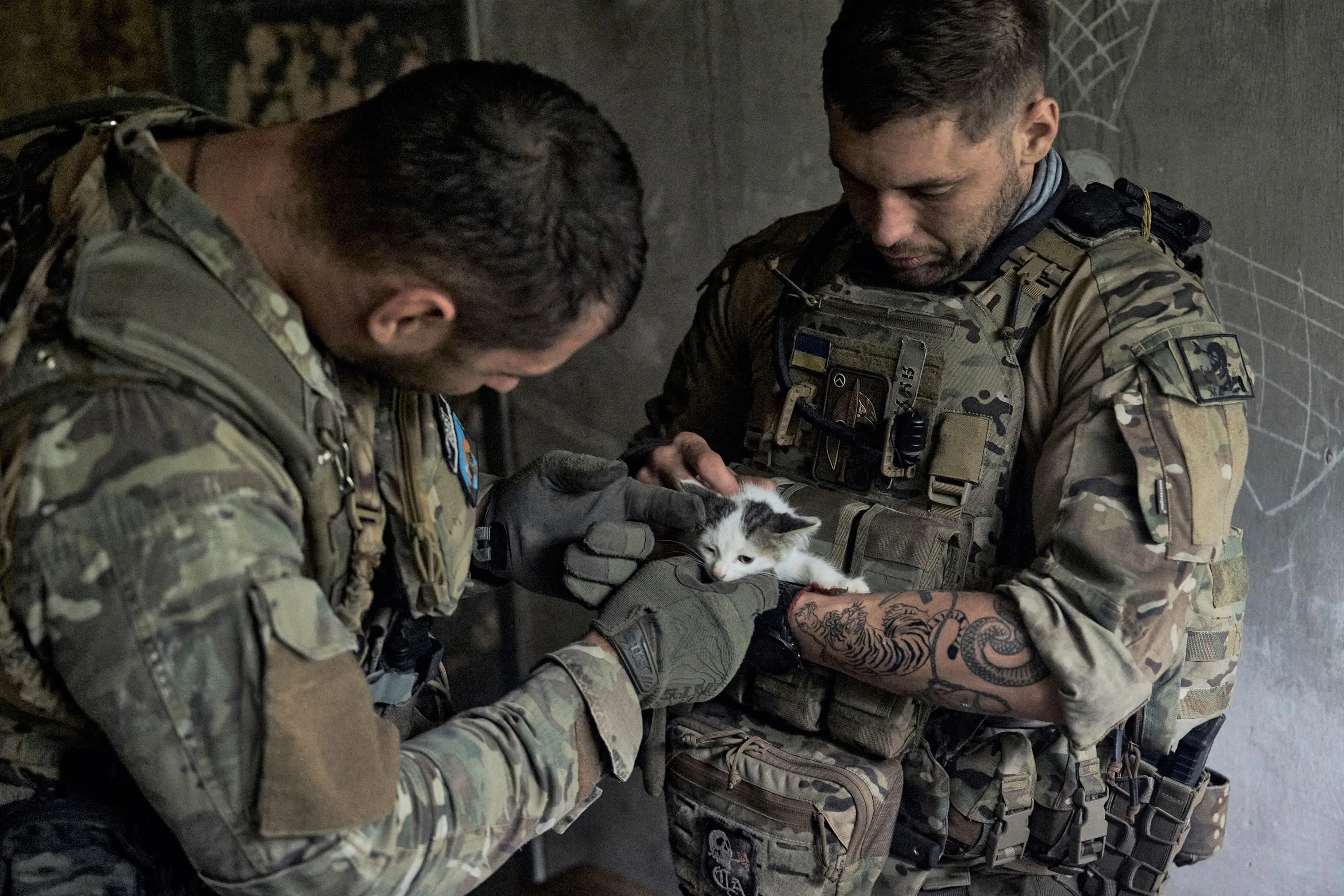 Ukrainian soldiers pet a kitten in a shelter under the Russian shelling on the frontline in the Zaporizhzhia region, Ukraine, Sunday, July 2, 2023. (Photo by Libkos/AP Photo)