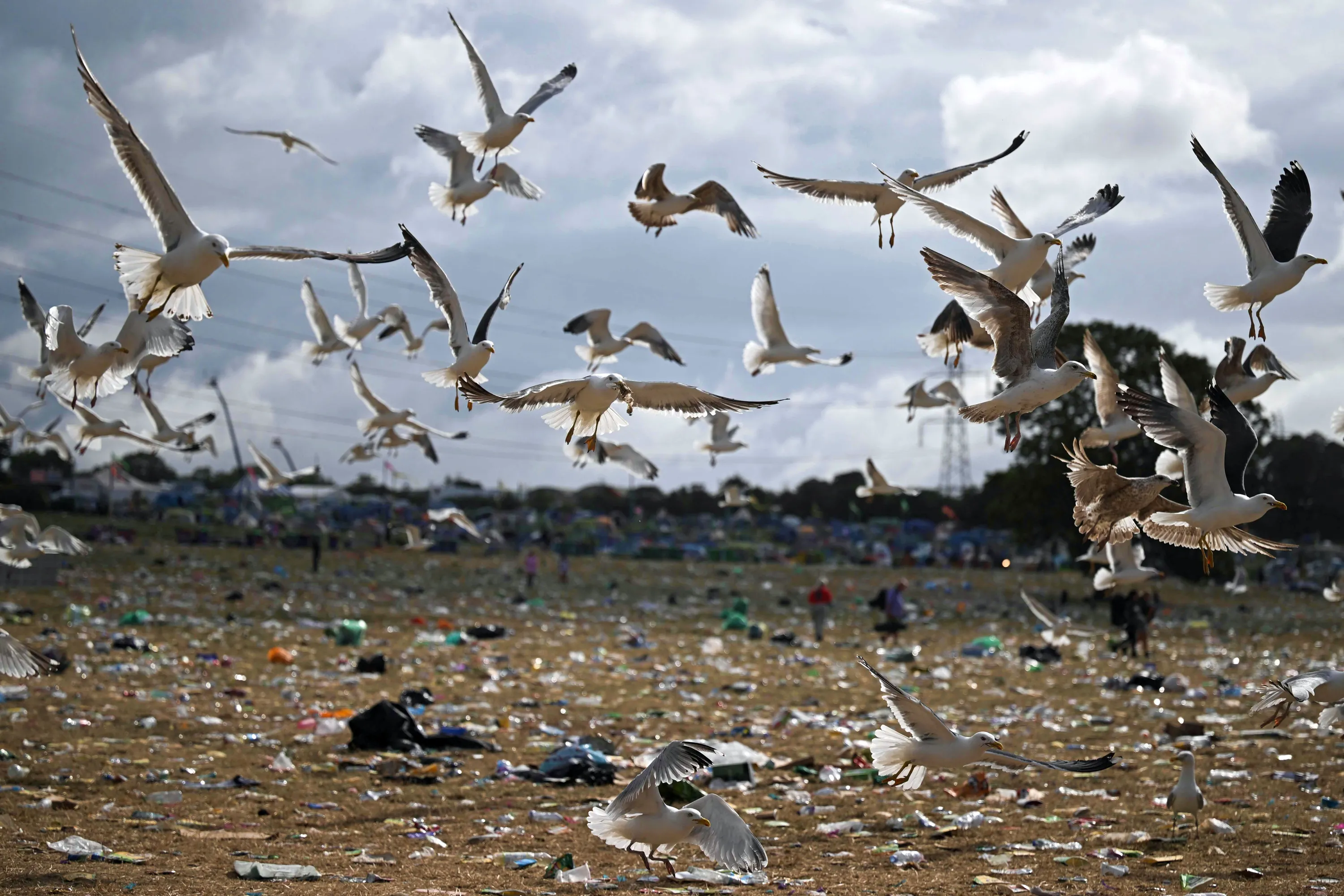 Seagulls pick up litter form a field at the end of Glastonbury festival in the village of Pilton in Somerset, southwest England, on June 26, 2023. The festival takes place from June 21 to June 26. (Photo by Oli Scarff/AFP Photo)