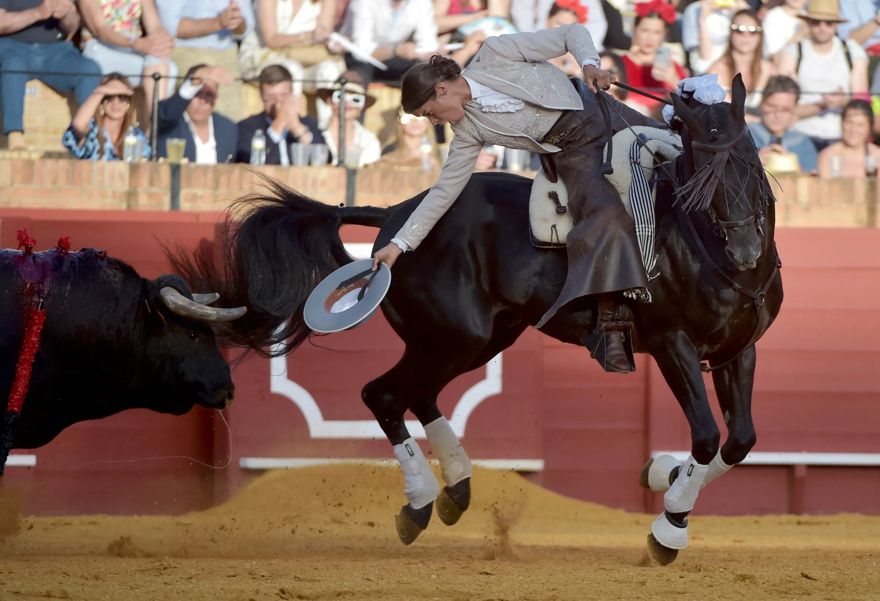 French “rejoneadora” (mounted bullfighter) Lea Vicens rides her horse in front of a bull during the Feria de Abril bullfighting festival at La Maestranza bullring in Seville on May 1, 2022. (Photo by Cristina Quicler/AFP Photo)
