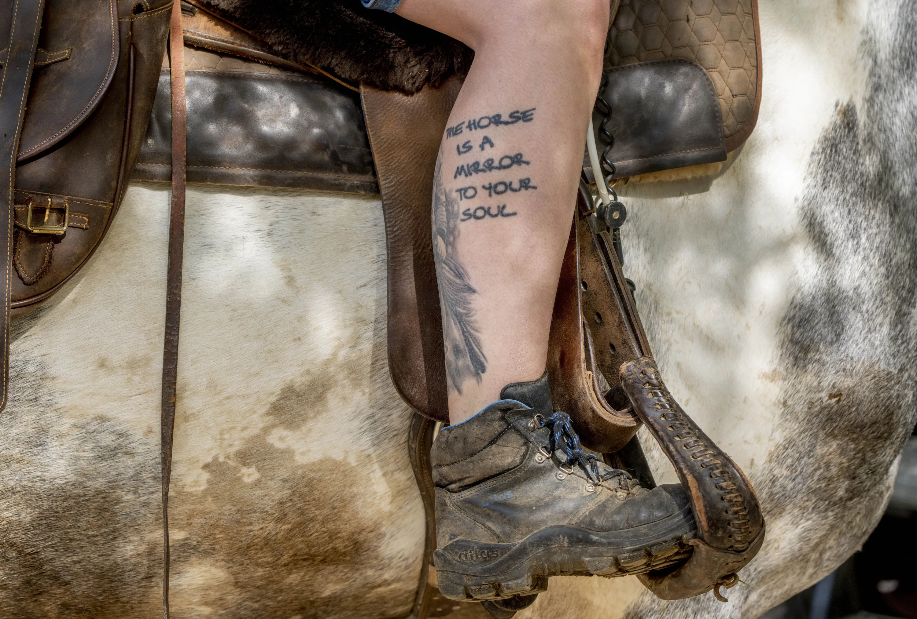 Horse farmer Stephanie Kirchner shows a tattoo on her leg in Oberweyer near Limburg, Germany, Thursday, May 19, 2022. Since the beginning of the war in the Ukraine causing rising gas prices Kirchner uses the coach or rides a horse to a small stud farm where she works whenever possible. (Photo by Michael Probst/AP Photo)
