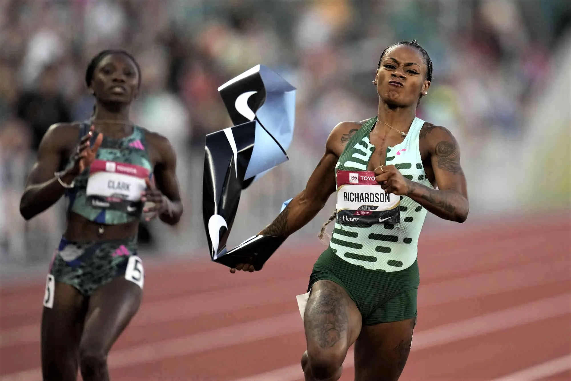Sha'Carri Richardson grabs the tape as she wins the women's 100 meter finals ahead of Tamara Clark during the U.S. track and field championships in Eugene, Ore., Friday, July 7, 2023. (Photo by Ashley Landis/AP Photo)
