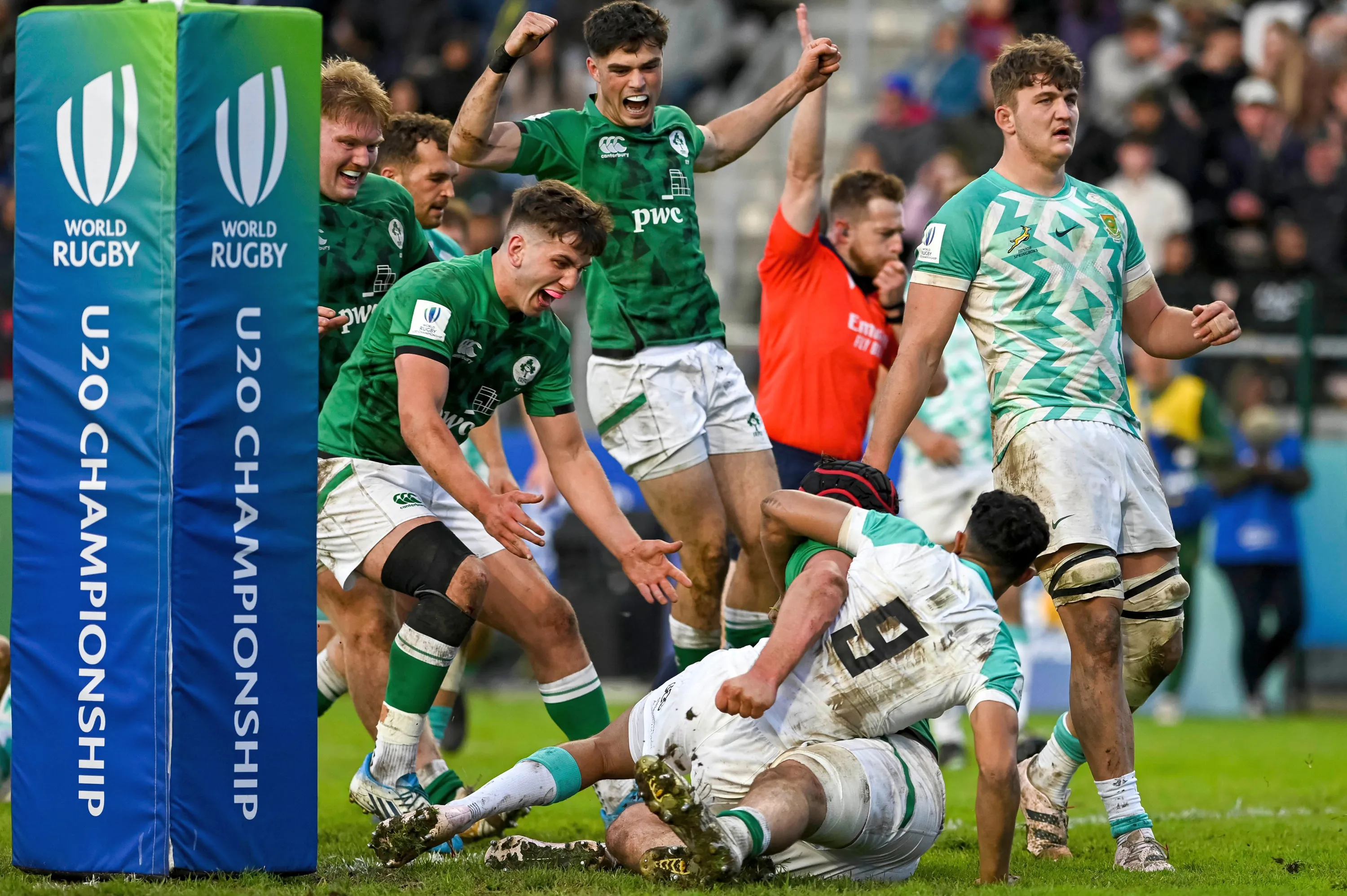 Ireland players celebrate as Brian Gleeson scores a try in the 2023 World Rugby Under-20 Championship semi-final at Athlone Sports Stadium in Cape Town, South Africa on July 9, 2023. (Photo by Darren Stewart/Inpho)