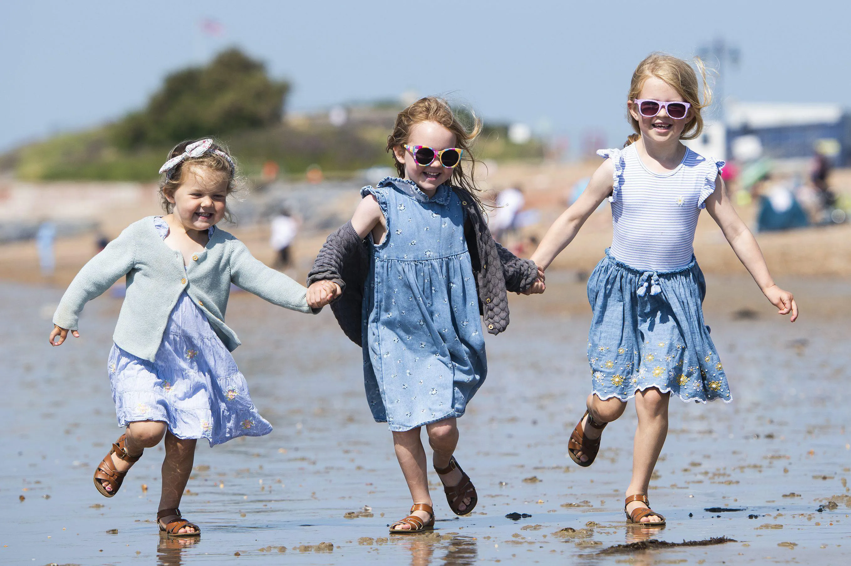 Sisters Rose four, Jessie, five, and Elodie Lanbert, six, get their matching sandals wet in Southsea, Hampshire in South East England on June 25, 2023. (Photo by Will Dax/Solent News)