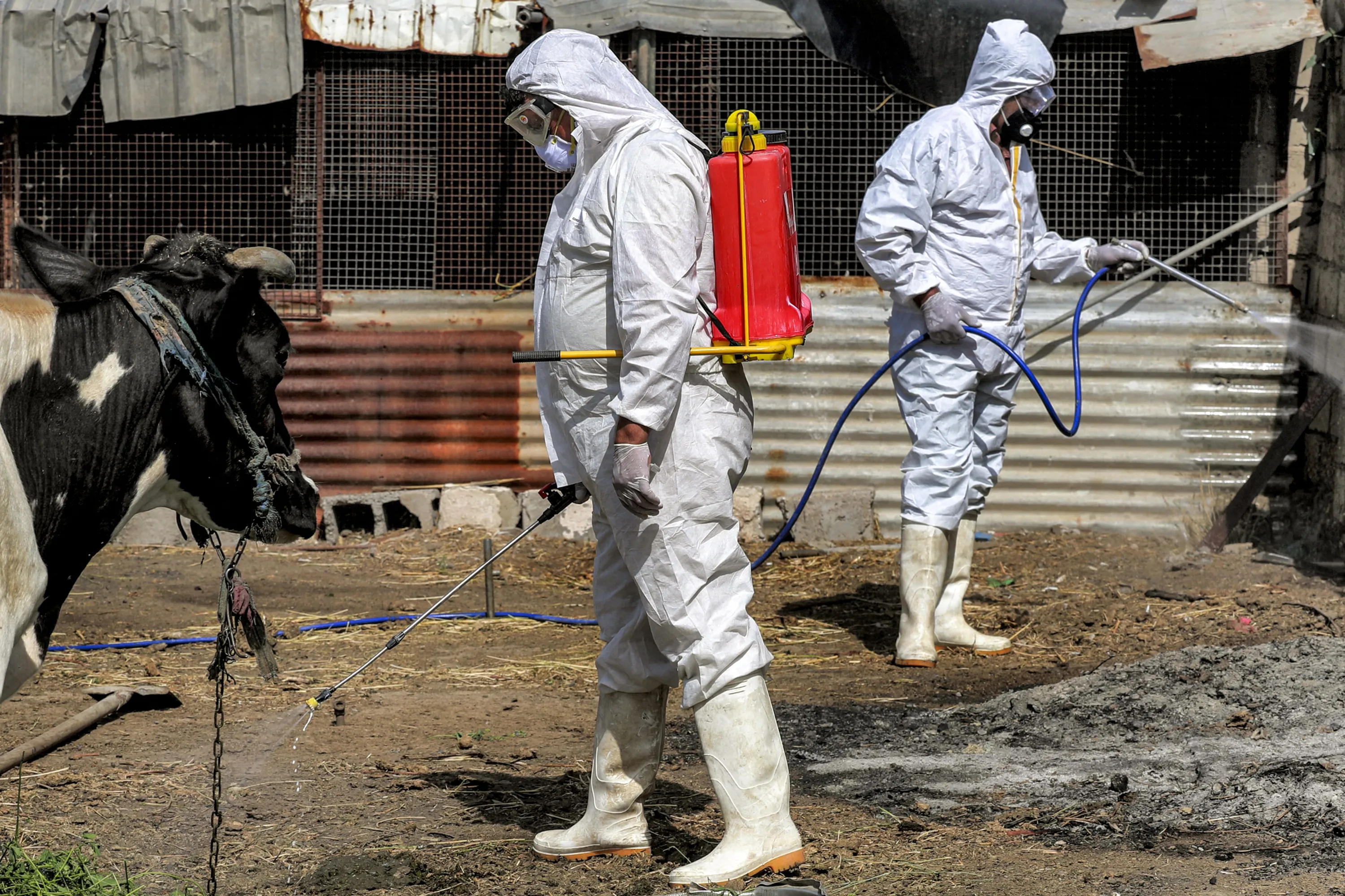 A medical team from Iraq's Health Ministry veterinarian department carries on a disinfection campaign on cows as a precaution against the spread of Congo haemorrhagic fever, at a farm in the southwestern Baghdad suburb of al-Bouaitha on May 22, 2023. At least 13 people have died in Iraq since the start of the year from a viral tick-borne disease transmitted to humans from livestock, the health ministry said on May 13. Nearly 100 other people have been infected by Crimean-Congo Haemorrhagic Fever (CCHF) in Iraq, where the disease claimed many more victims last year. (Photo by Ahmad Al-Rubaye/AFP Photo)