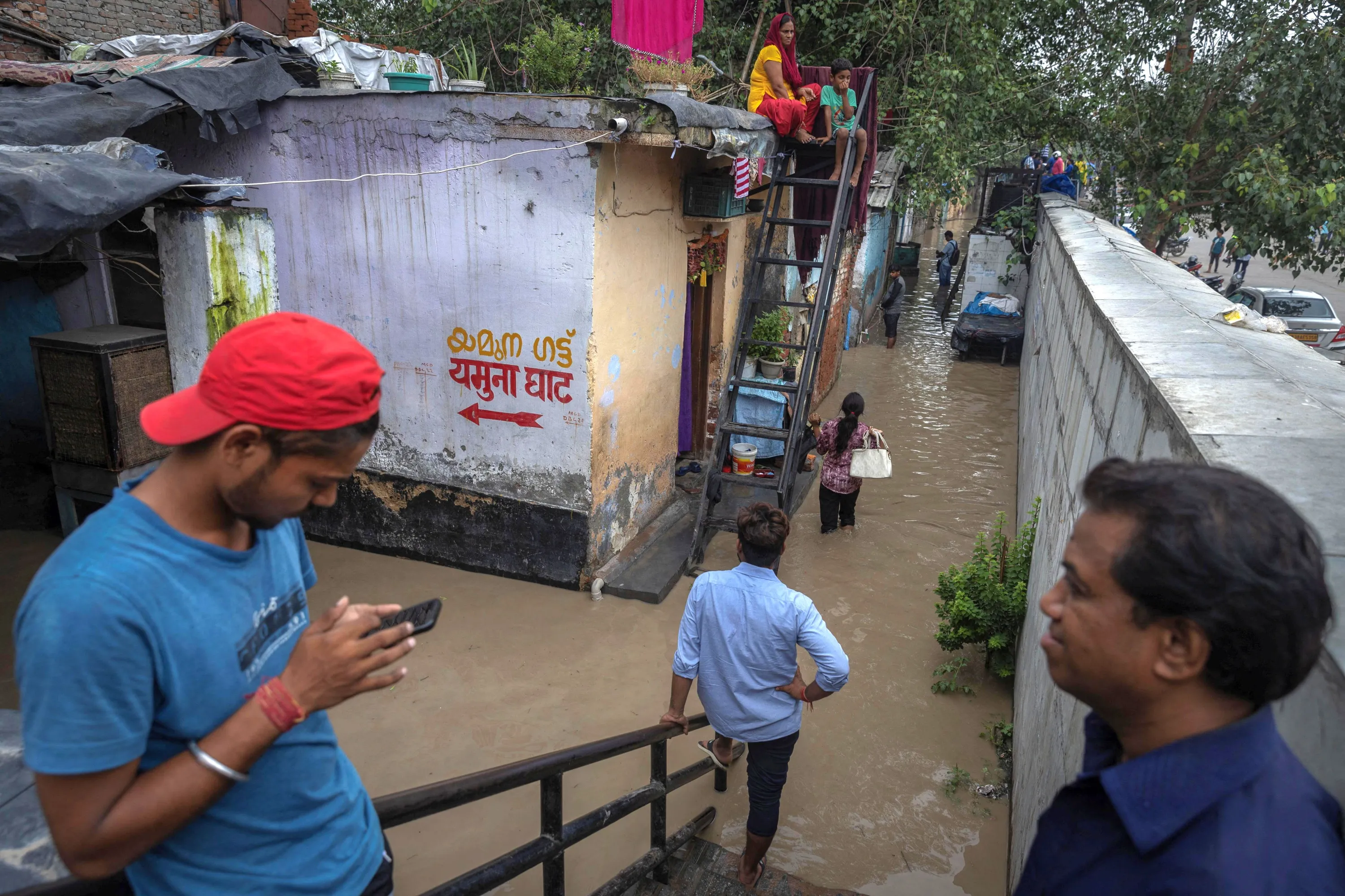 Residents stand outside their flooded houses by the rising waters of river Yamuna after heavy monsoon rains in New Delhi, India on July 11, 2023. (Photo by Adnan Abidi/Reuters)
