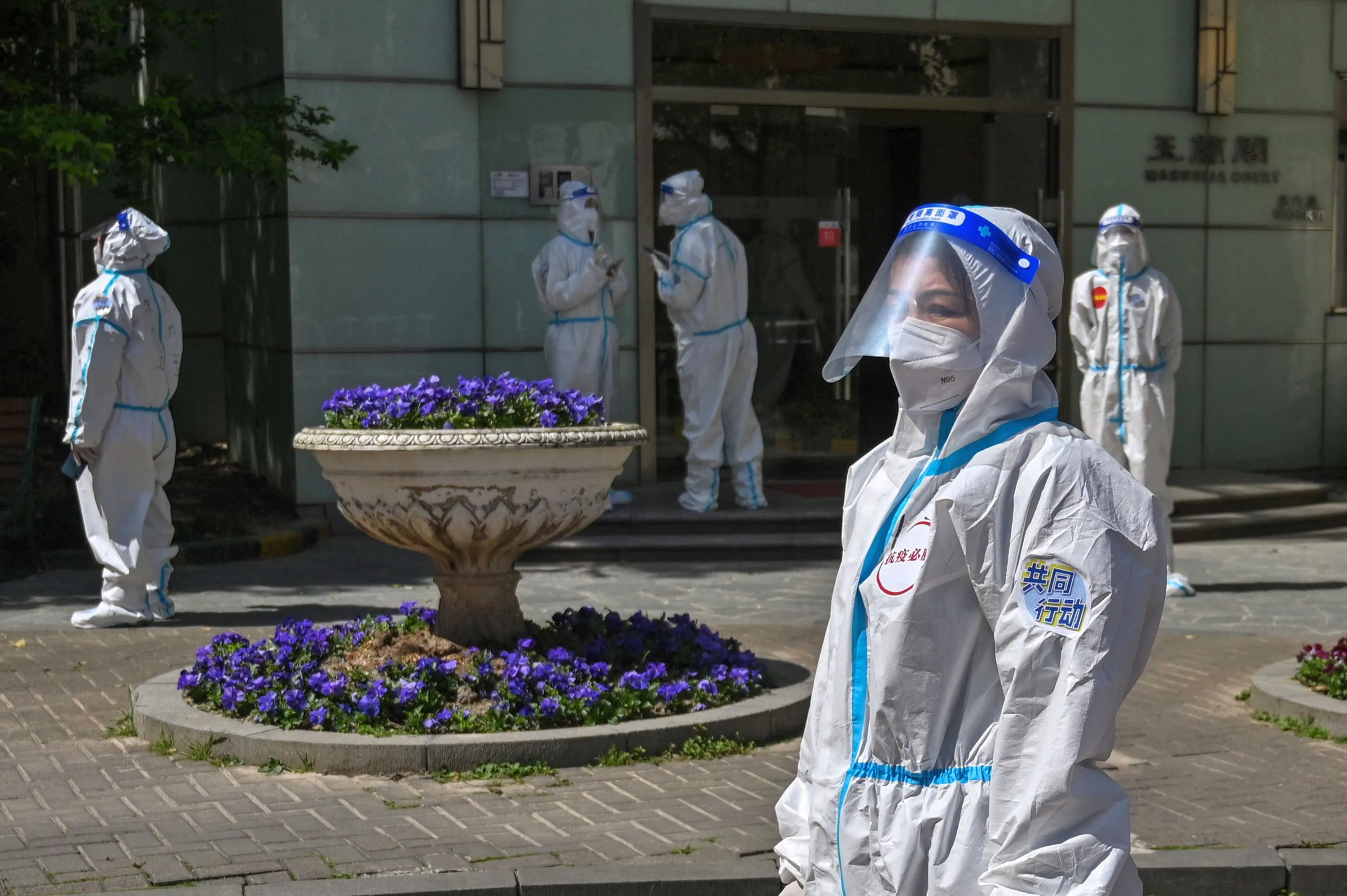 Workers and volunteers look on in a compound where residents are tested for the Covid-19 coronavirus during the second stage of a pandemic lockdown in Jing' an district in Shanghai on April 4, 2022. (Photo by Hector Retamal/AFP Photo)