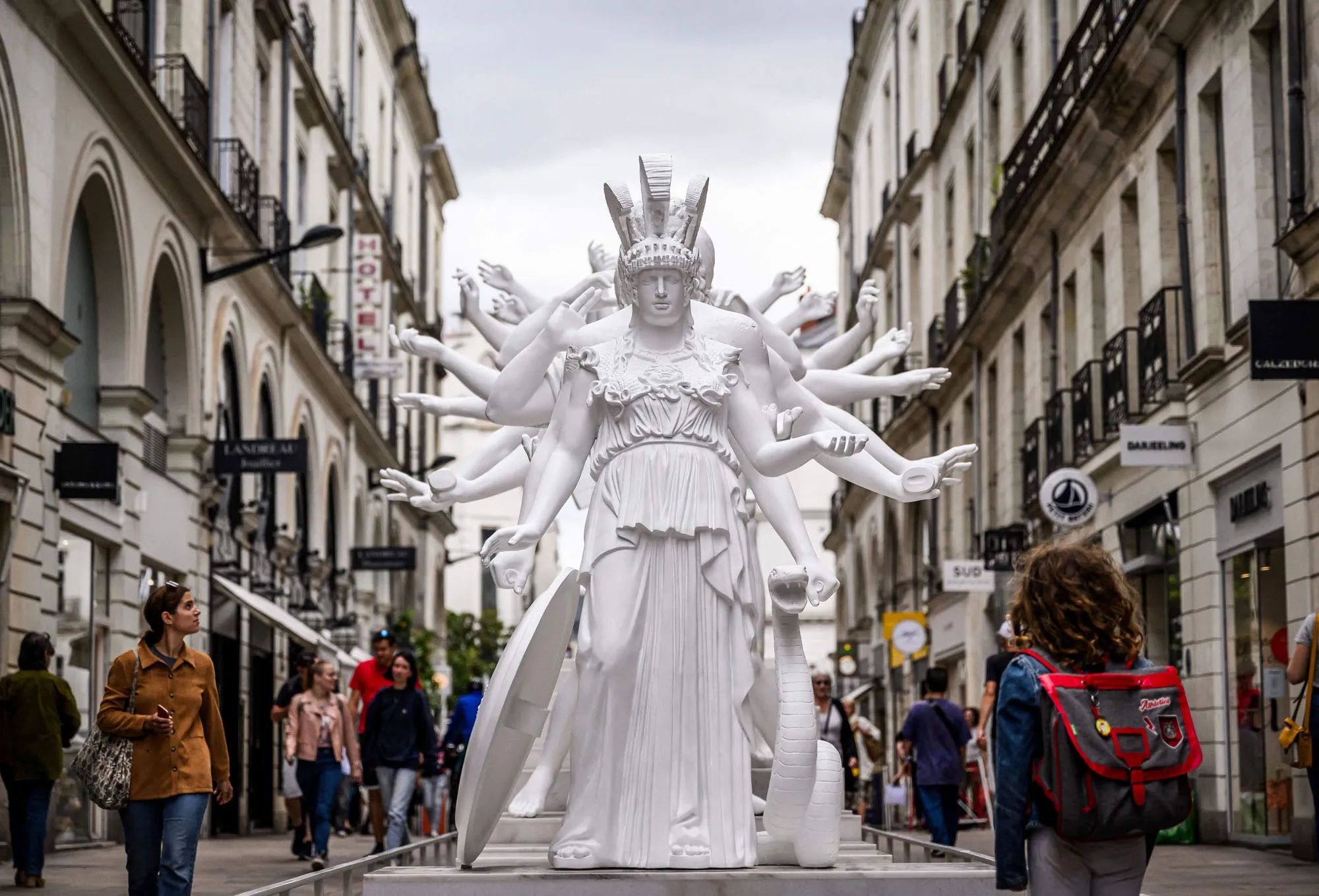 Members of the public walk past the “European Thousand-Arms Classical Sculpture” by Chinese artist Xu Zhen, on July 5, 2023, as part of the “Le Voyage à Nantes” Art Fair. “Le Voyage à Nantes” Art Fair, welcoming around 50 cultural elements on a 12 kilometer-long trail reactivated by artists, architects, designers and garderners, runs from July 1 to September 3. (Photo by Loic Venance/AFP Photo)