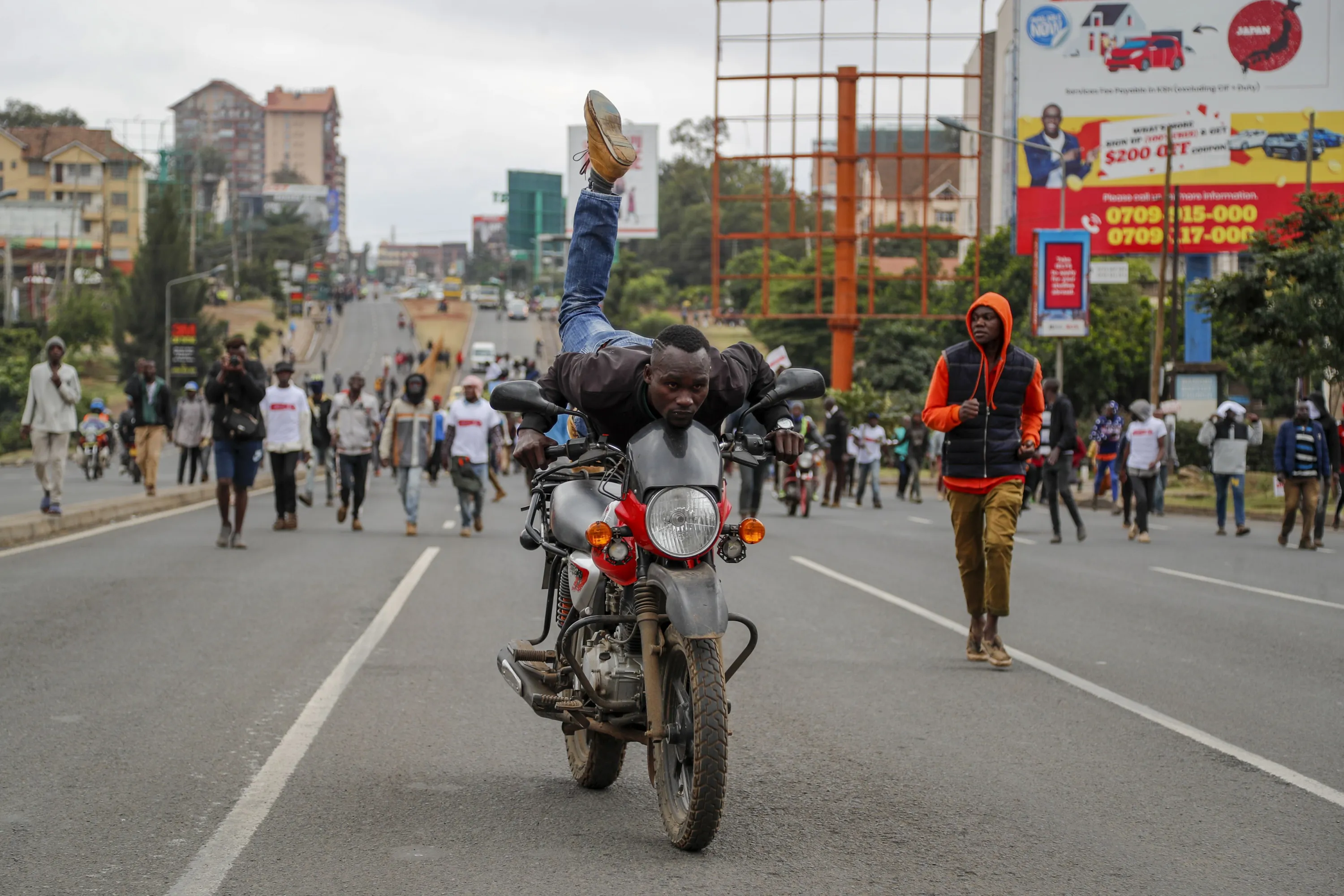 A demonstrator shows off as he rides a motorcycle during protests in the capital Nairobi, Kenya Friday, July 7, 2023. (Phoot by Brian Inganga/AP Photo)