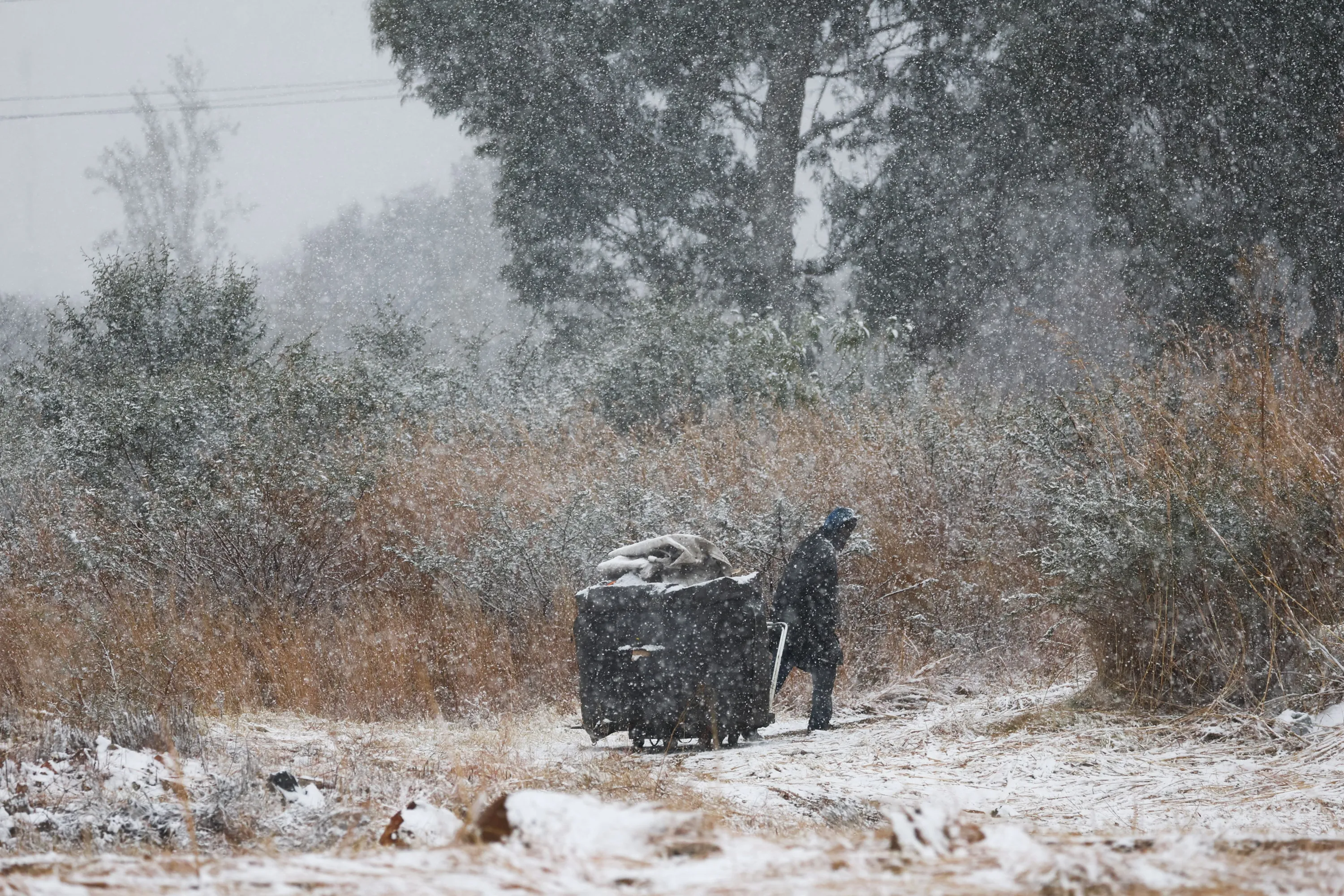 A garbage collector moves a trash bin amid snowfall in Brackenhurst, a suburb south of Johannesburg, South Africa on July 10, 2023. (Photo by Siphiwe Sibeko/Reuters)