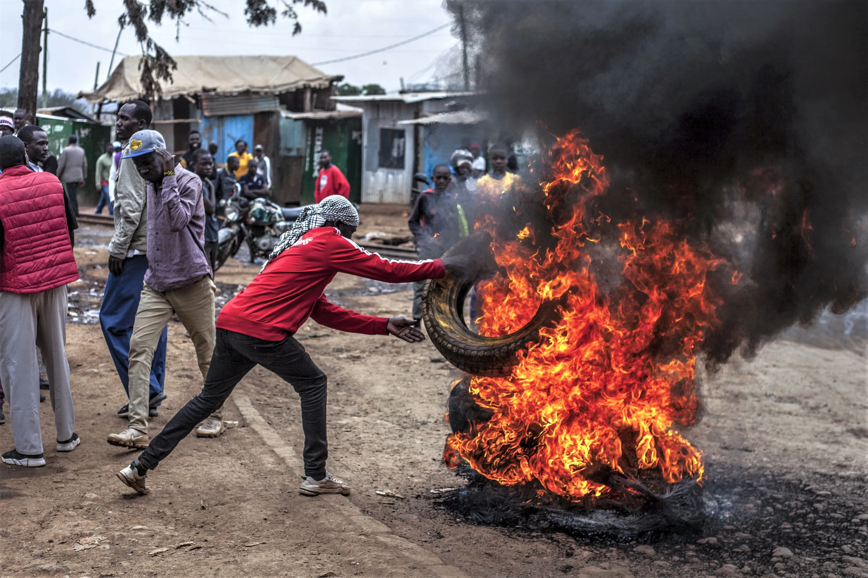 A protester burns tyres to block the road in the Kibera neighborhood of Nairobi, Kenya, Wednesday, July 12, 2023. (Photo by Samson Otieno/AP Photo)