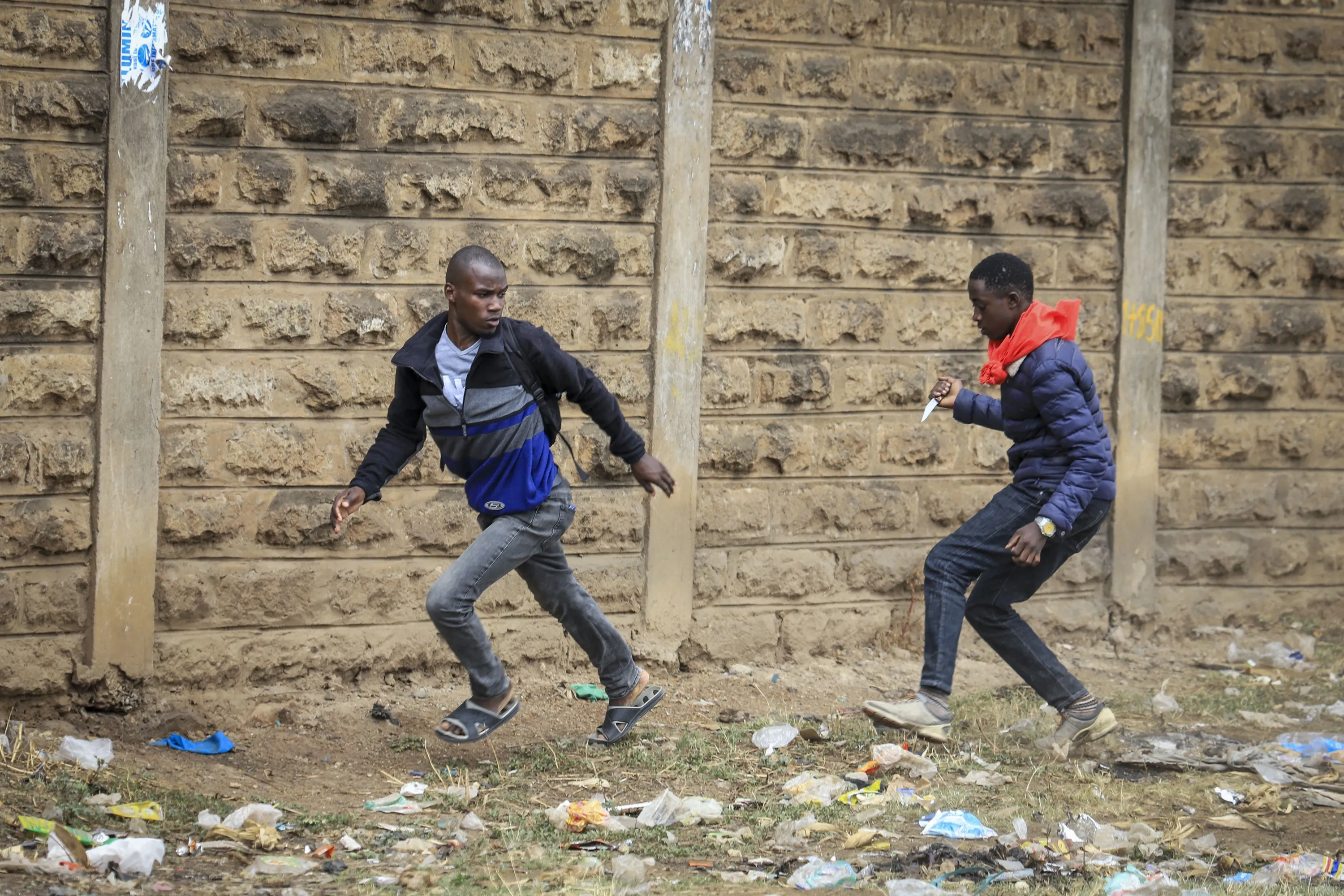 An unidentified man holding a knife, right, tries to rob a pedestrian, left, during clashes between police and protesters in the Mathare neighborhood of Nairobi, Kenya Wednesday, July 12, 2023. (Photo by AP Photo/Stringer)