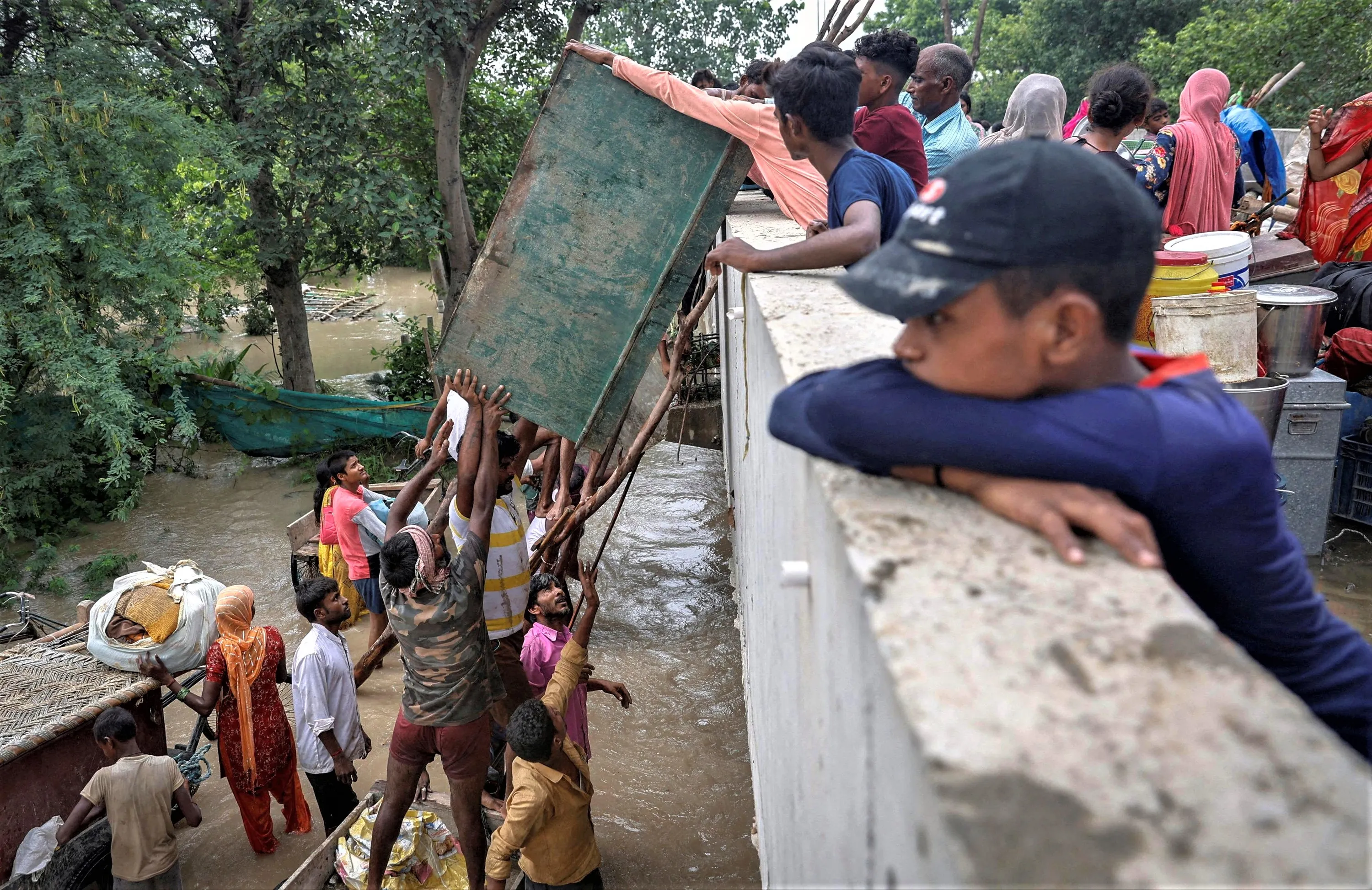 Residents use tree branches to climb on a flyover under construction, after being displaced by the rising water level of river Yamuna after heavy monsoon rains in New Delhi, India on July 12, 2023. (Photo by Adnan Abidi/Reuters)