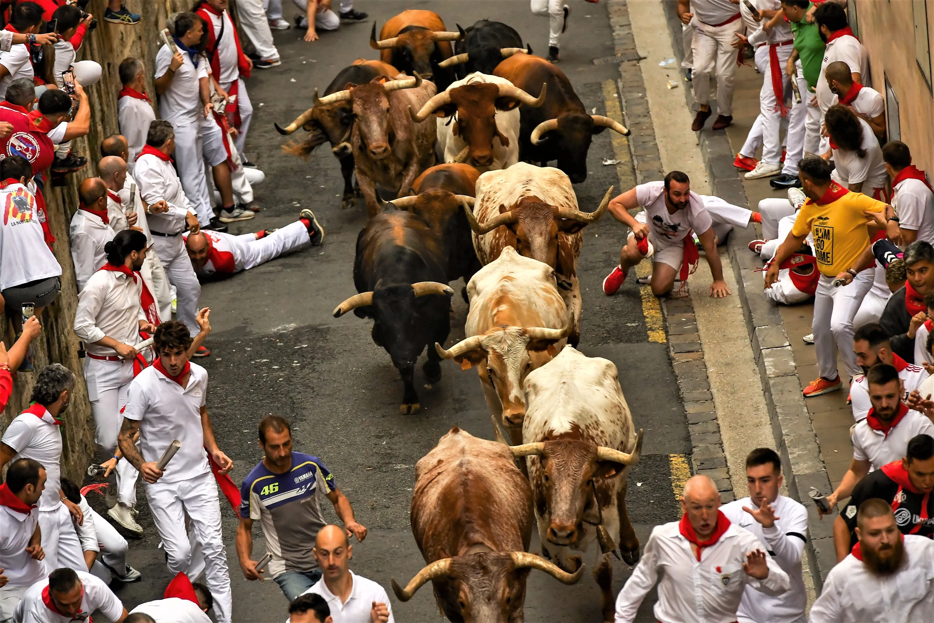 La Palmosilla's fighting bulls run among revellers during the first day of the running of the bulls during the San Fermin fiestas in Pamplona, Spain, Friday, July 7, 2023. (Photo by Alvaro Barrientos/AP Photo)