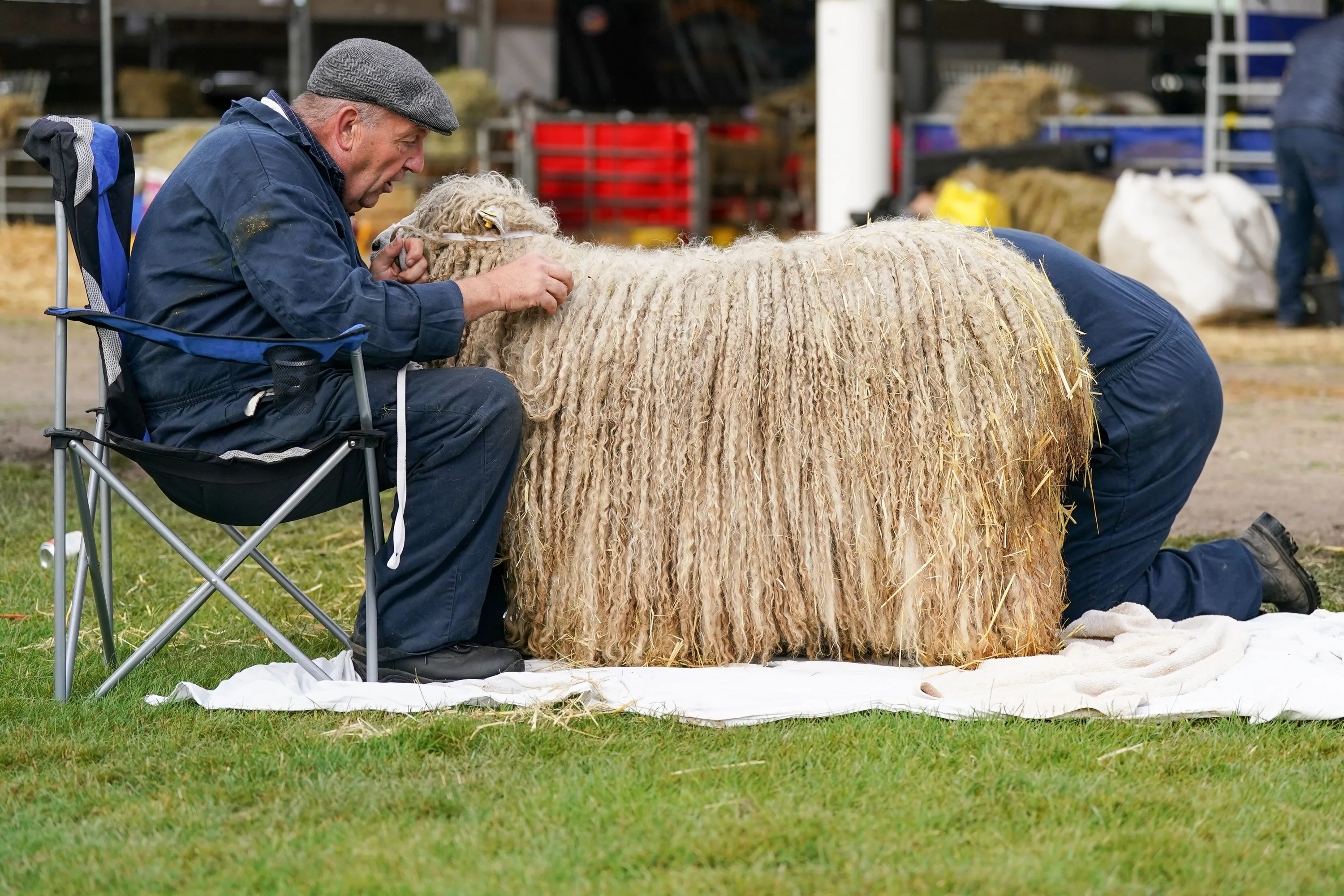 A man picks straw from the wool of his sheep as he prepares for competition during the first day of the 164th Great Yorkshire Show on July 11, 2023 in Harrogate, England. Held at the Yorkshire Showground the Great Yorkshire Show is known as one of the best agricultural shows in the UK, welcoming 140,000 people to the 250-acre site. The four-day show celebrates agriculture, food, farming and countryside, with a respect for tradition while welcoming new additions. (Photo by Ian Forsyth/Getty Images)