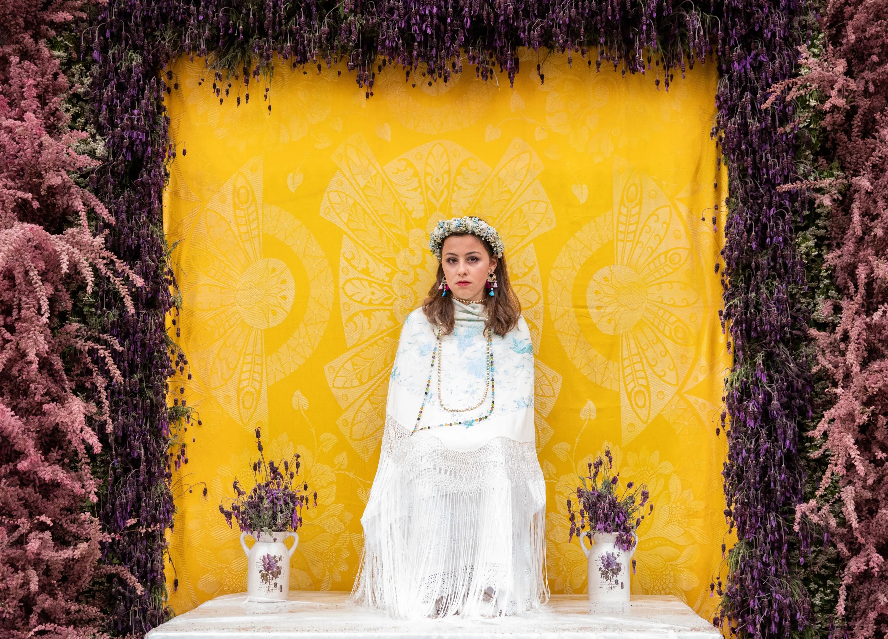A girl, La Maya, sits on the altar during the celebration of La Maya festivity on May 02, 2022 in Colmenar Viejo, Spain. Each year, Las Mayas, typically girls in Colmenar Viejo are chosen to sit at a freshly made flower altar to mark the new spring season. (Photo by Aldara Zarraoa/Getty Images)