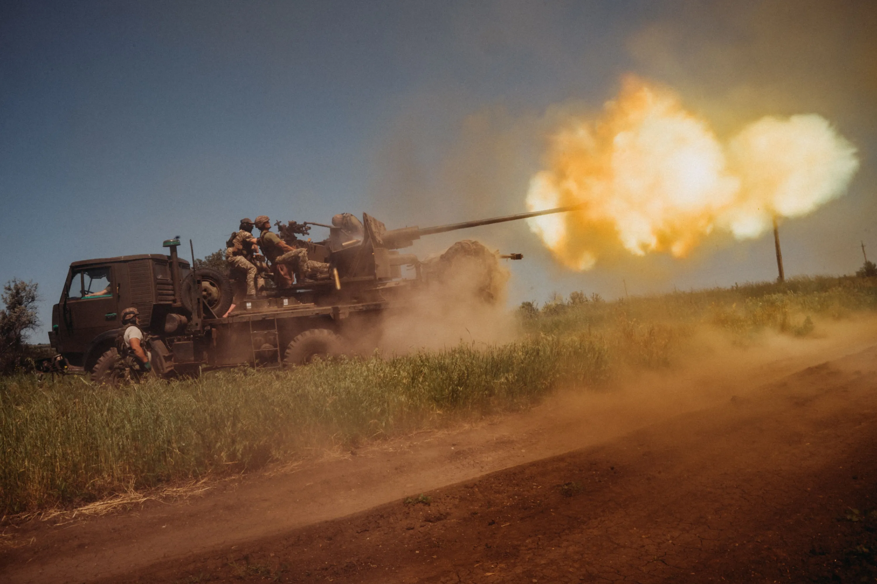 Ukrainian soldiers from the 60th Battalion of Territorial Defense, are shooting rounds into Russian positions with an S60 anti-aircraft canon placed on a truck, outside Bakhmut, Ukraine on June 19, 2023. (Photo by Wojciech Grzedzinski/Anadolu Agency via Getty Images)