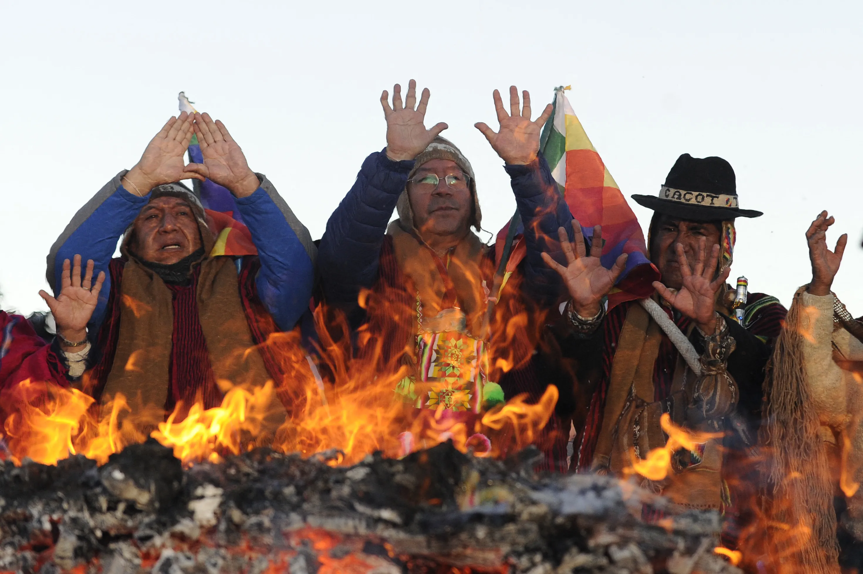 Bolivian President Luis Arce (C) and Vice-President David Choquehuanca (L) participate in the celebration of the winter solstice and the New Year of the Andean Indigenous people, which marks the beginning of the year 5531, at the archaeological site of Tiwanaku, about 70 km from La Paz, on June 21, 2023. (Photo by Jorge Bernal/AFP Photo)