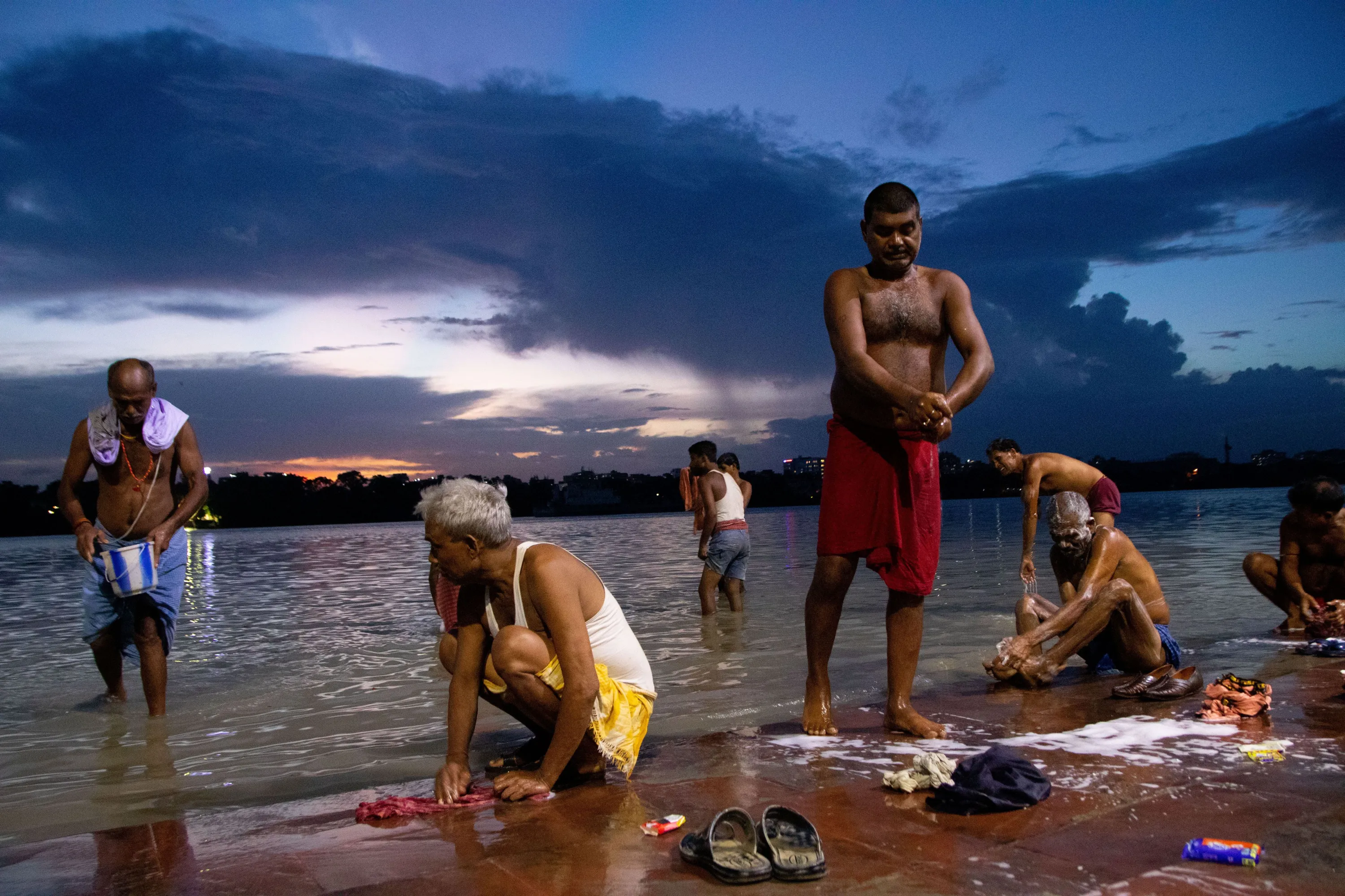 People are bathing on the bank of the Ganges River in Kolkata, India, on Tuesday, July 18, 2023. (Photo by Debajyoti Chakraborty/NurPhoto via Getty Images)