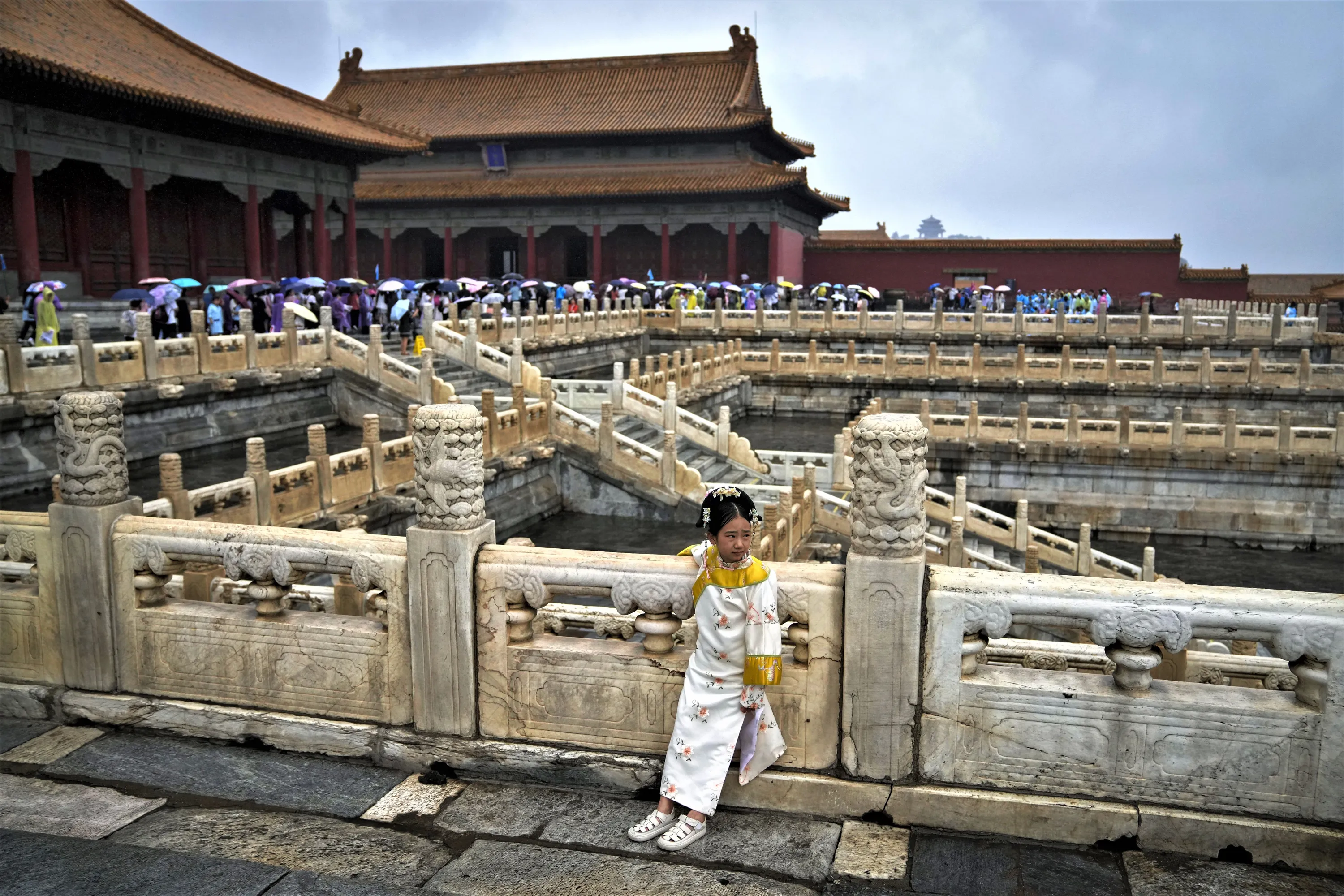 A girl wearing a traditional costume stands as visitors carrying umbrellas tour the Forbidden City on a rainy day in Beijing, Thursday, July 13, 2023. (Photo by Andy Wong/AP Photo)
