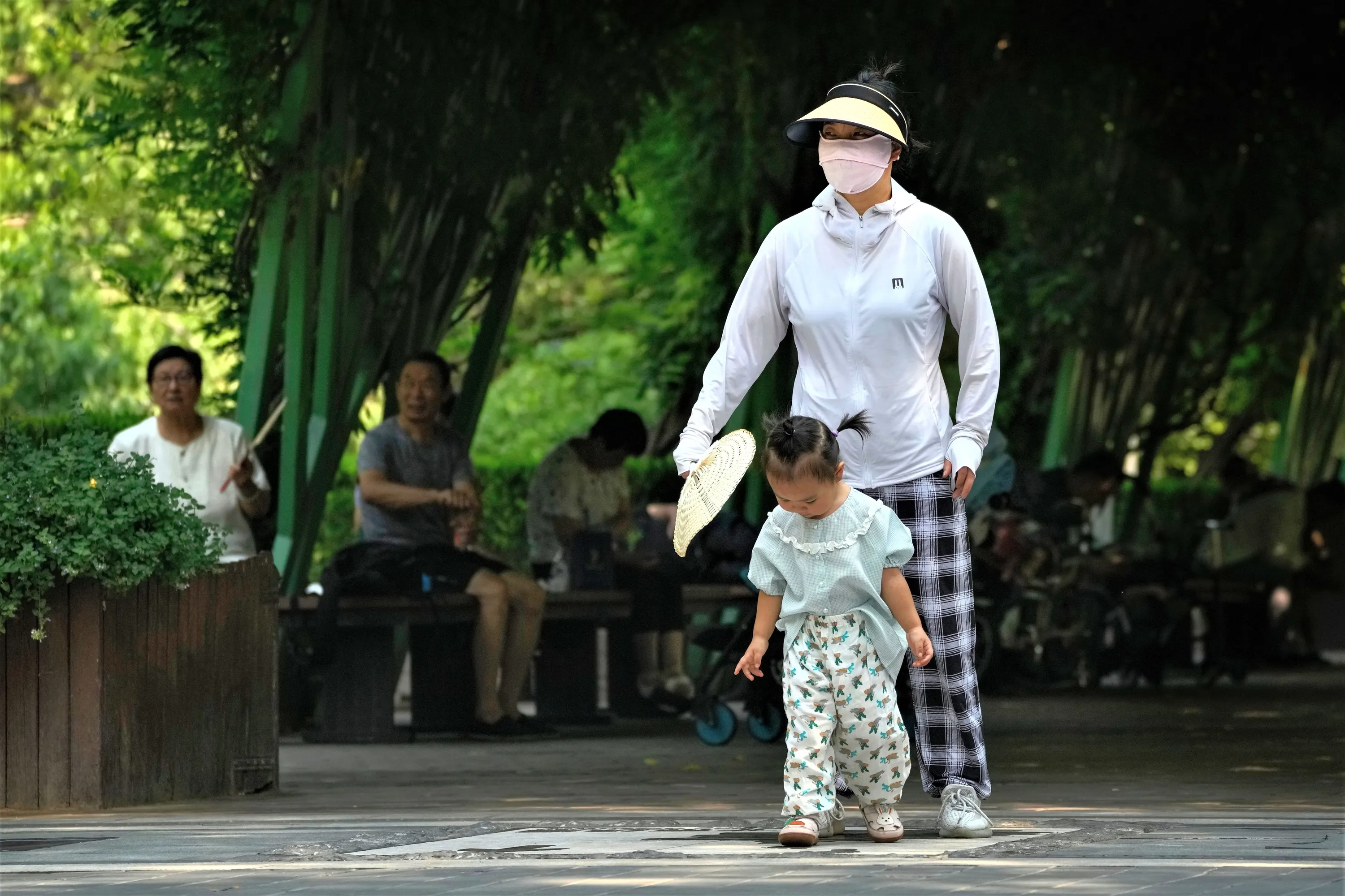 A woman uses a fan to cool a child as residents rest in a shade at a public park on a sweltering day in Beijing, Tuesday, July 18, 2023. (Photo by Andy Wong/AP Photo)