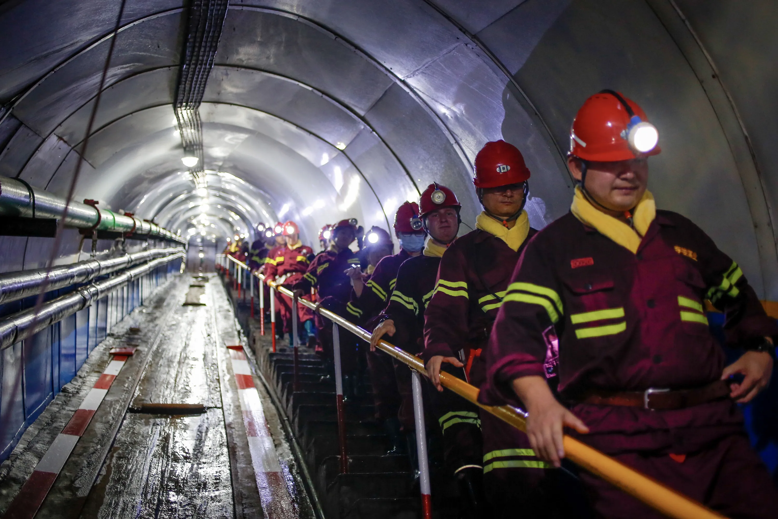 People walk down a mining site during an organized media tour at the Lilou Coal Mine in Heze, Shandong province, China, 19 July 2023. Members of the press visited the Lilou Coal Mine to view the first commercial application of artificial intelligence (AI) for the mining industry called the Pangu Mine Model. The AI model is capable of visual recognition capabilities, analyzing the quality of stress relief drilling, and can assist in rock burst prevention personnel in quality verification, reducing the review workload by 82 percent, shortening the check to 10 minutes from three days with 100 percent acceptance rate. (Photo by Mark R. Cristino/EPA)