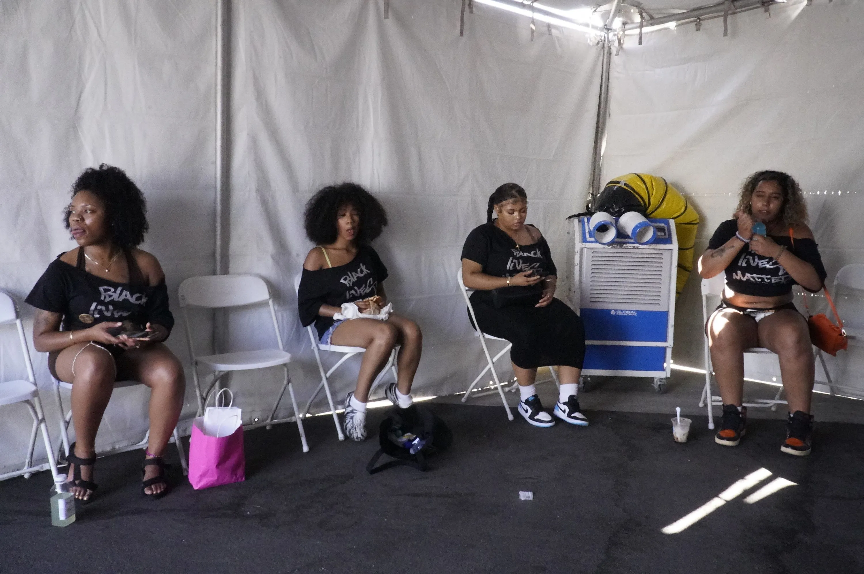 People rest inside a cooling tent next to an air-conditioning unit during the “#BLM Turns 10 People's Justice Festival” Saturday, July 15, 2023, at the Leimert Park neighborhood in Los Angeles. Mayor Karen Bass announced the city was opening cooling centers where residents could escape the heat. (Photo by Damian Dovarganes/AP Photo)