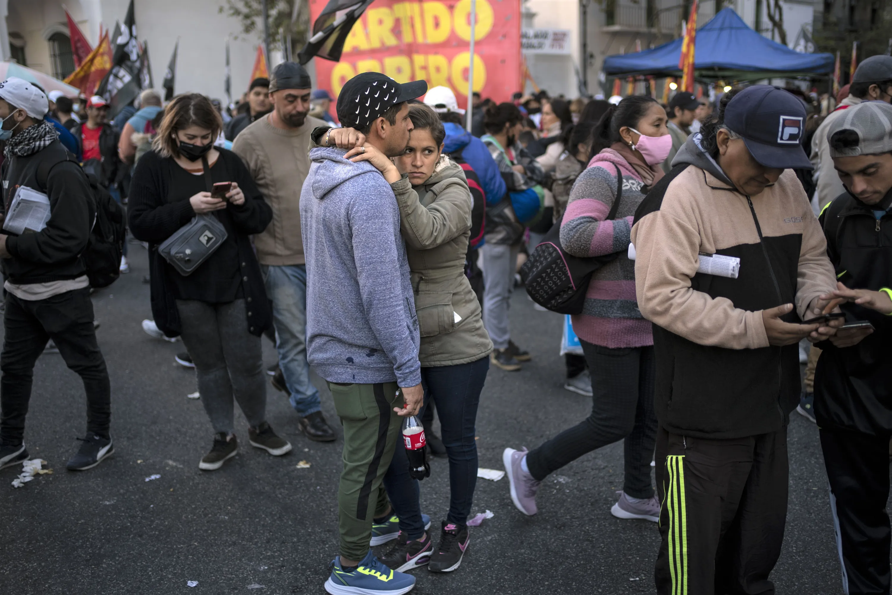 A couple embraces during an event for Labor Day in Buenos Aires, Argentina, Sunday, May 1, 2022. (Photo by Rodrigo Abd/AP Photo)
